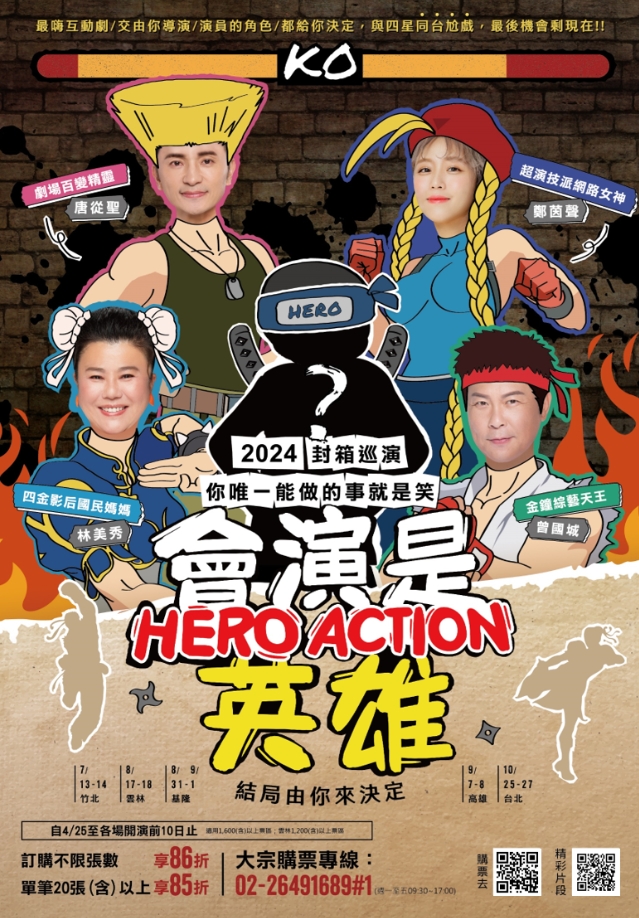 一、 2022 年 9 場的巡演, 2023 年破千萬的票房, 2024 年《會演是英雄》封箱巡演,再創紀錄。一齣集結明星脫口秀、現場多媒體互動投票、表演訓練及經典戲劇的新型態演出,沒有劇本的即興互動不僅充滿變數、笑料與驚喜外,現場每位觀眾還能自由選擇演出劇本與結局。透過輕鬆有趣的演出,讓學子們從中見證明星們多年來從事演藝的深厚功力及經驗分享,包含克服上台恐懼、口語表達、活用聲音與表情、邏輯思考組織內容、溝通邏輯等等面向,掌握到輕鬆幽默的說話藝術。