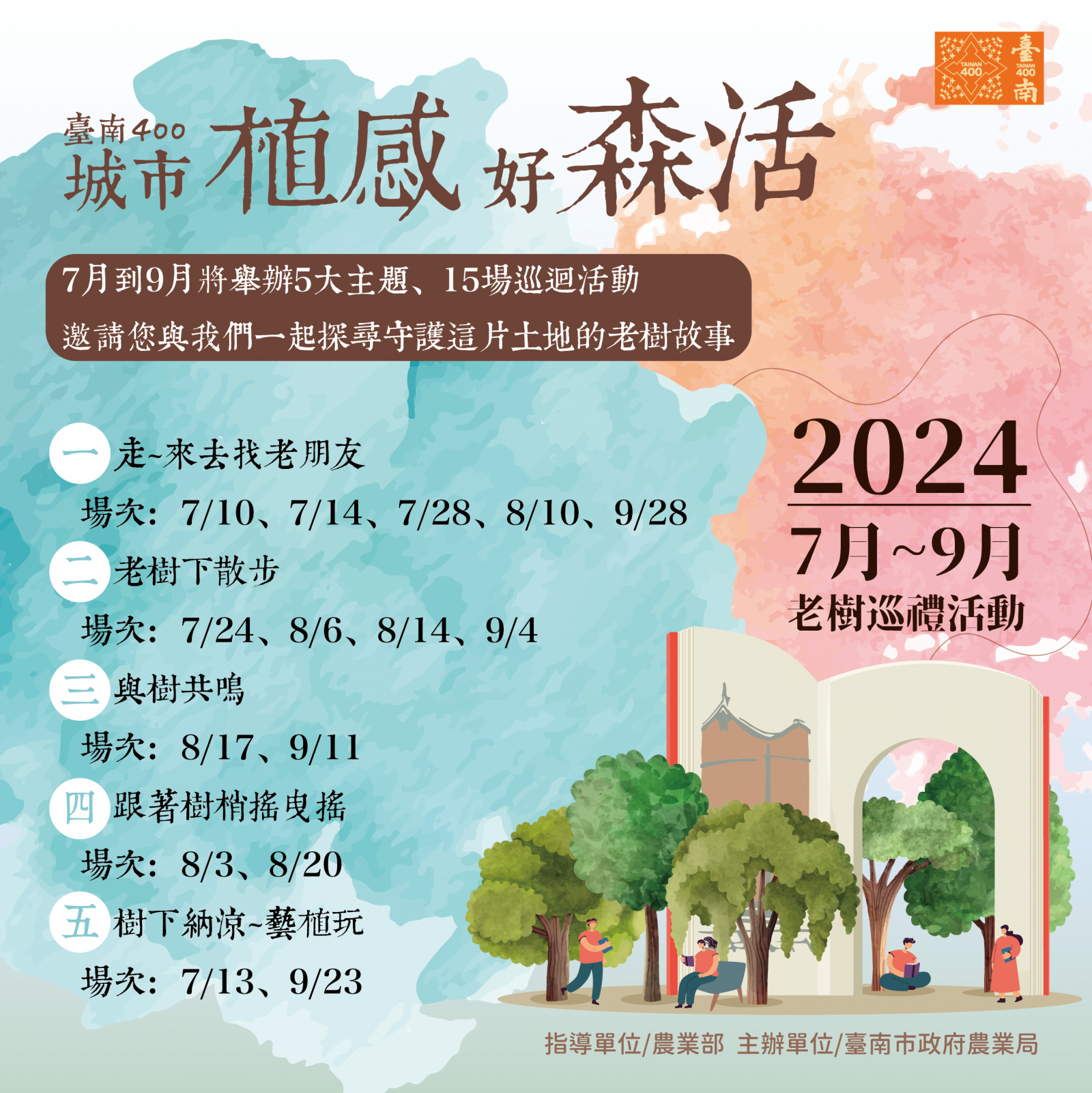 二、 2024 年適逢臺南建城 400 年,為彰顯老樹在這座城市的重要性,同時也是最貼近歷史的見證者,該局從 113 年 7 月 10 日起至 113 年 9 月 28 日舉辦老樹巡禮系列活動 15 場,引領民眾親近老樹,提升對老樹價值的認識及生態保育意識,敬請協助推廣至校園、社區鄰里。
