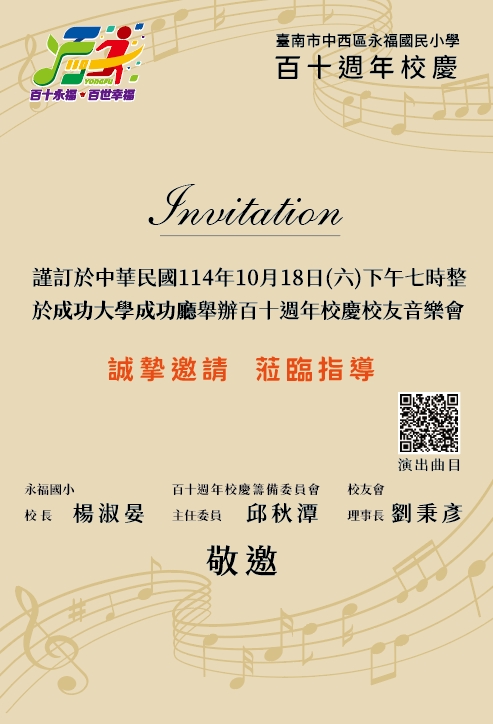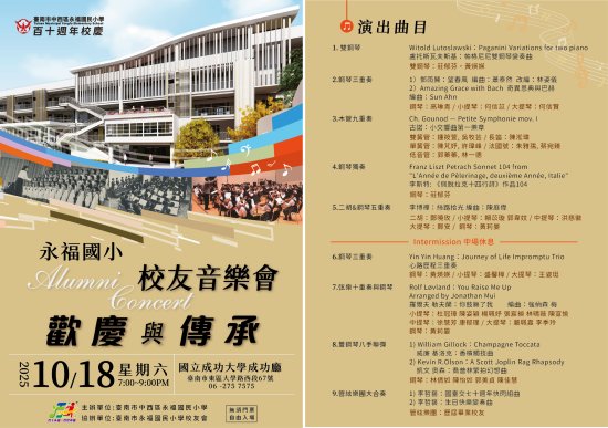 謹訂於中華民國114年10月18日(六)下午七時整,於成功大學成功廳舉辦百十週年校友音樂會