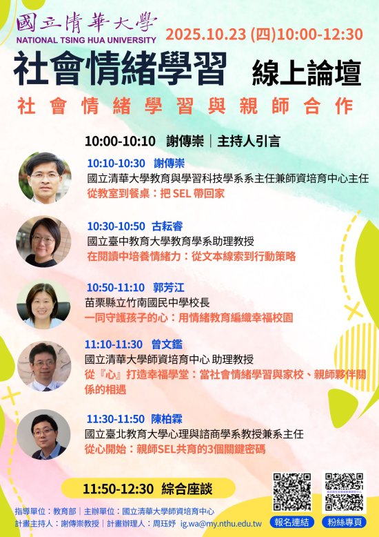 二、清華大學師資培育中心於 114 年 10 月 23 日(星期四)上午 10 時至 12 時 30 分,舉辦「社會情緒學習線上論壇-社會情緒學習與親師合作」線上論壇,旨在探討如何透過社會情緒學習(SEL)的核心理念,促進教師與家長之間的有效合作,建立支持性的學習環境。論壇聚焦於學生自我覺察、人際互動與情緒管理等能力的培養,並進一步延伸至家庭與學校間的互動模式。期望藉由專家學者的經驗分享與教育現場的案例交流,啟發多元策略,協助教師與家長攜手合作,共同培養學生健全的人格發展與積極的學習態度。
