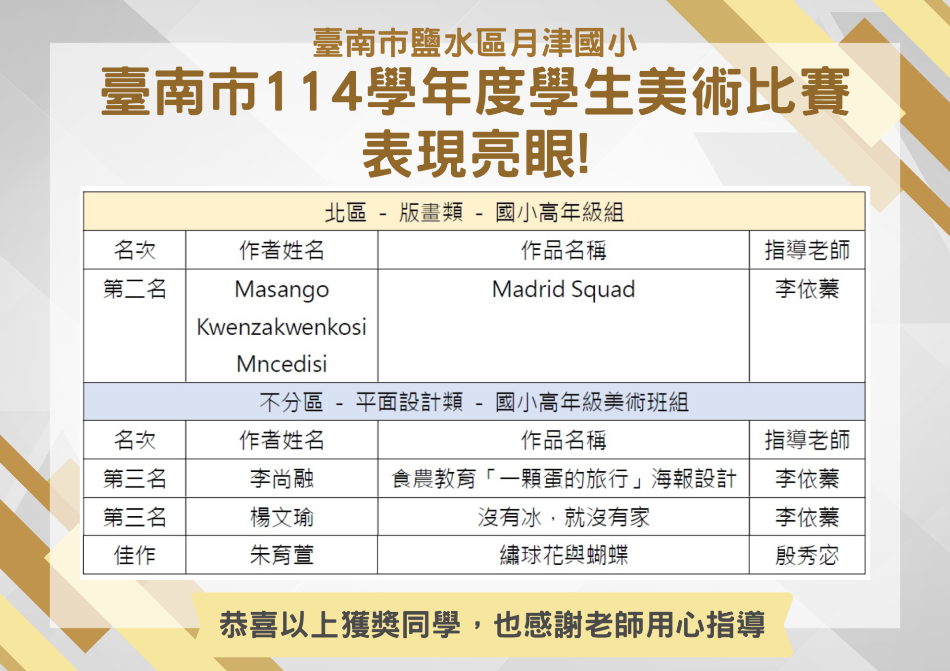 賀!!本校學生參加臺南市114學年度學生美術比賽,成績亮眼!