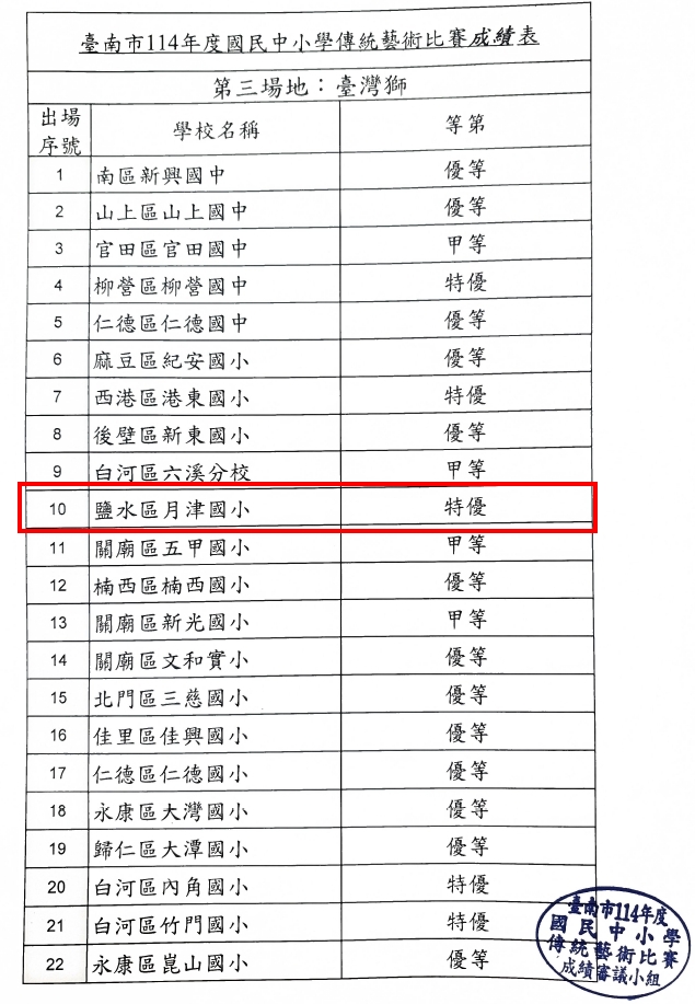 恭賀本校舞獅隊參加114年度傳統藝術比賽榮獲「臺灣獅-國小組」特優佳績