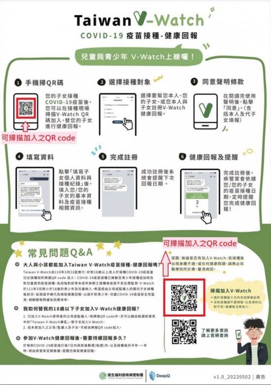 V-Watch 自本(111)年 5 月 3 日起已將小於 18 歲的兒童及青少 年納入追蹤監測對象,經由父母或監護人同意並透過手機 代為填寫健康回報,以積極加強監測、收集分析該族群接 種後常見不良反應發生情形,提升兒童、青少年 COVID-19 疫苗安全性監測,以及相關關懷照護與因應處置效率。