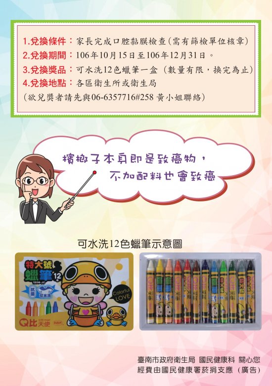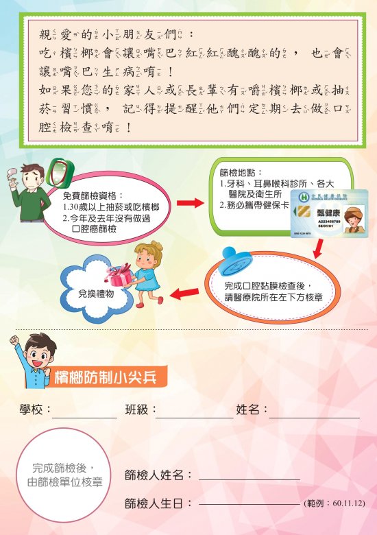 (二)活動內容:國小學童取得衛教篩檢單(如附件)後,鼓勵有菸檳行為之家長完成口腔黏膜檢查,即可兌換禮物 1 份。