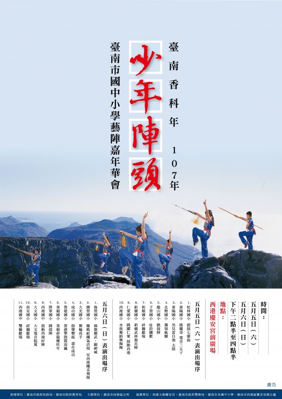 主旨:本所訂於 107 年 5 月 5 、 6 日(星期六、日)假本區慶安宮前廣場舉辦「107 年臺南市國中小學藝陣嘉年華會」活動,隨文檢附活動文宣 1 份,請惠予協助宣傳並鼓勵踴躍前往觀賞