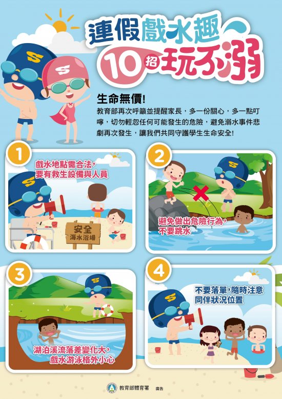 一、夏日將至,為降低溺水事件發生率,維護學生安全,體育署提供「新防溺 10 招圖片」與「宣導影片—假面水男孩 S」,請學校務必透過各種管道加強宣導。