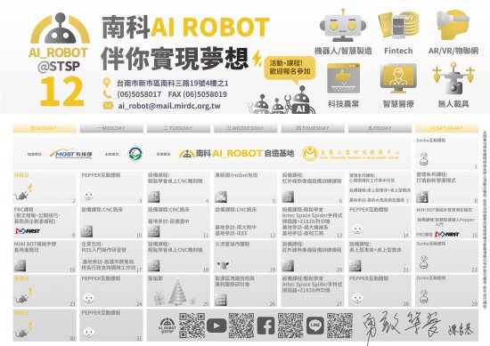 二、檢附「南科 AI_ROBOT 自造基地」12 月活動 DM 及官方網站 http://ai-robot-stsp.tw/、 Facebook 社團、 Line 社團加入連結(附件一、二),敬請協助宣傳。