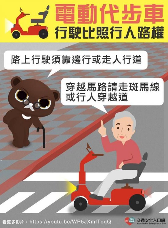 「電動代步車行駛比照行人路權,穿越馬路請走斑馬線或行人穿越道,路上行駛須靠邊行或走人行道哦!臺南市政府關心您。