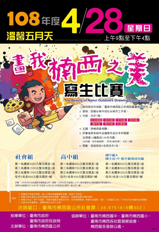 2、頒獎: 108 年 5 月 7 日星期二上午 10 點至臺南市立楠西國 民中學活動中心。