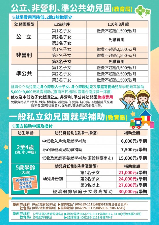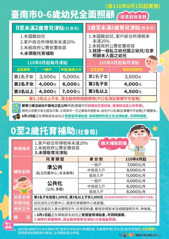「2歳至未滿5歲育兒津貼:自110年8月1日起,家中有生理年齡滿2歲至當學年度9月1日前未滿5歲之本國籍幼兒,除配合中央設定排富條款外,補助額度提高為每月3,500元,第二名子女加發500元,第三名以上子女加發1,000元,正在領取該名幼兒之育嬰留停津貼者,可同時請領。請至幼兒戶籍所在地公所提出申請」