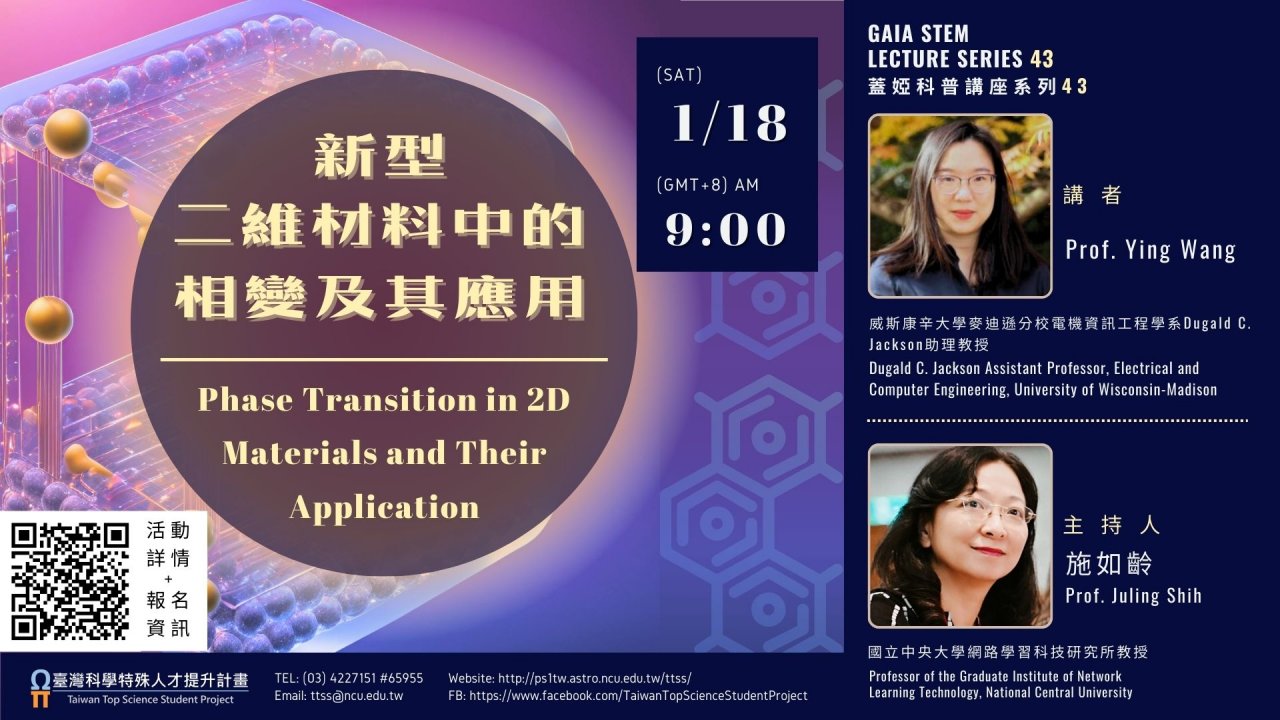 一、本次講座將由 Ying Wang 教授主講,帶領我們探索新型二維材料中的相變現象及其應用。二維材料作為現代材料科學的研究熱點,以其獨特的物理與化學性質展現出極高的學術與應用價值。其中,二維材料中的相變為功能設計與應用拓展提供了豐富的可能性。