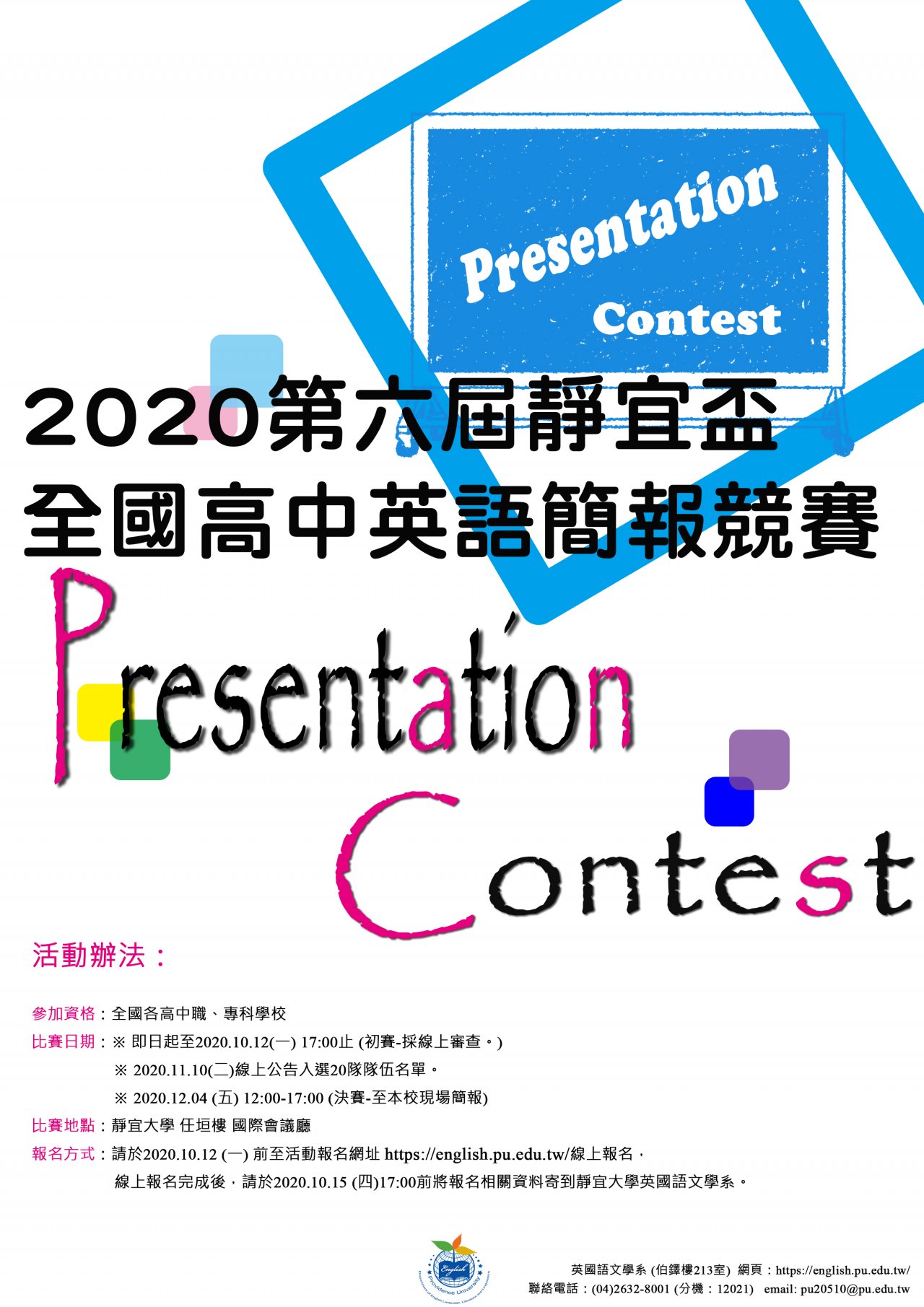 主旨:靜宜大學英國語文學系將舉辦「2020第六屆靜宜盃全國高中英語簡報競賽」,敬邀貴校學生踴躍報名參加,請查照。