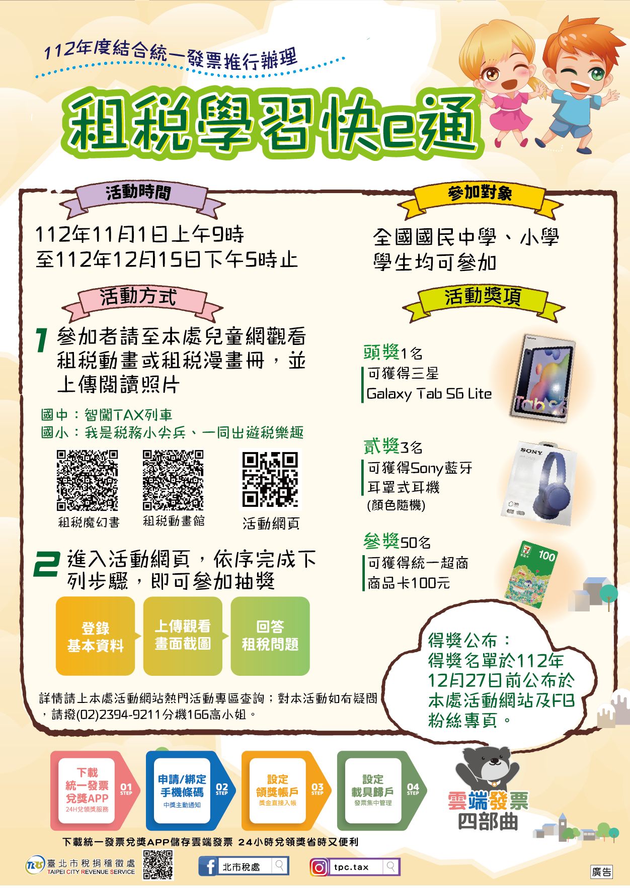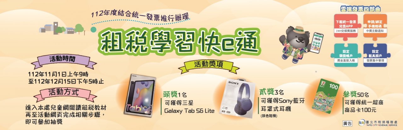 三、全國國中、國小學生於活動期間至臺北市稅捐稽徵處兒童網觀看租稅教育動畫或漫畫,將閱讀情形拍照上傳活動網頁,並正確回答租稅問題,就有機會獲三星 Galaxy Tab S6 Lite 、 Sony 藍牙耳罩式耳機及統一超商商品卡 100 元等多項好禮!(活動詳情如附件)