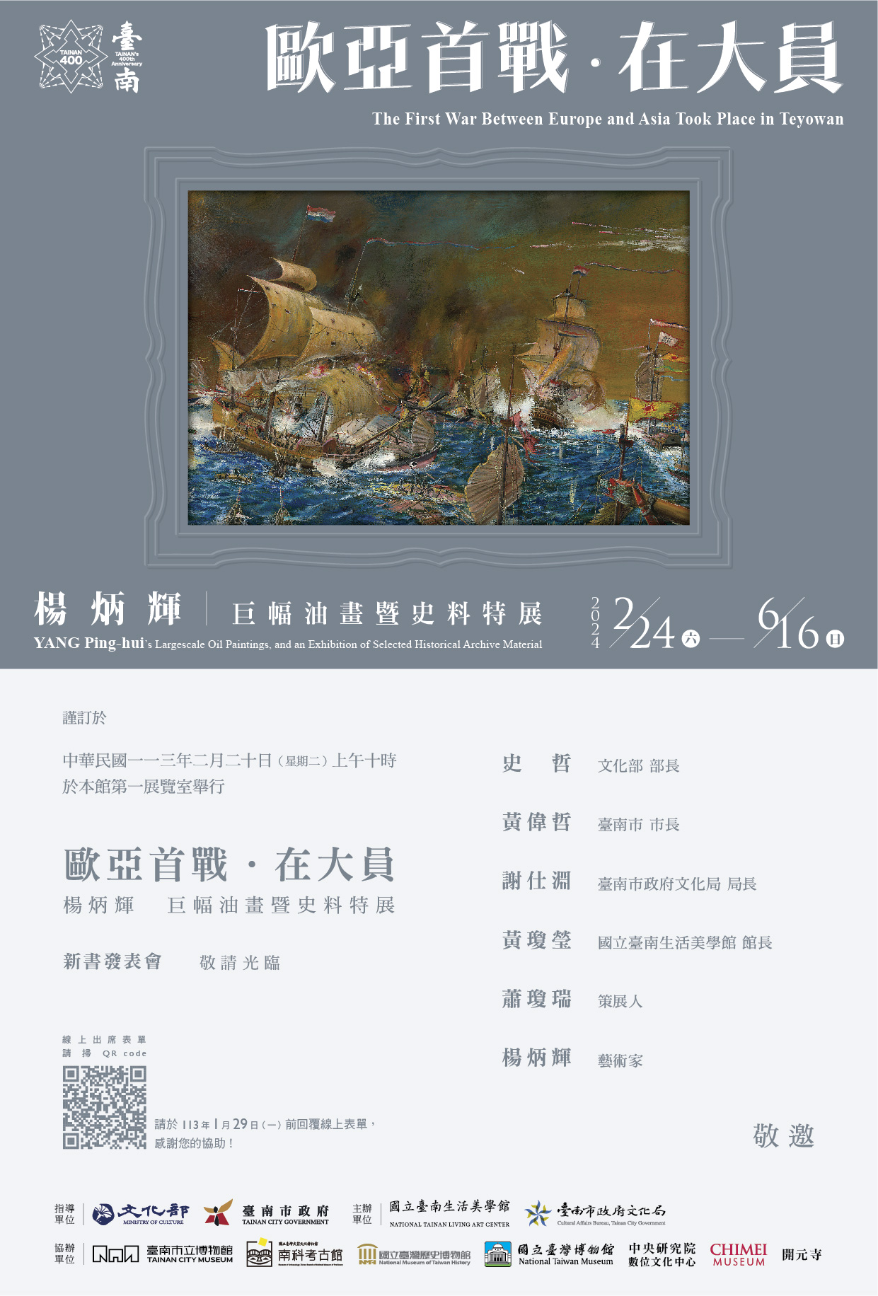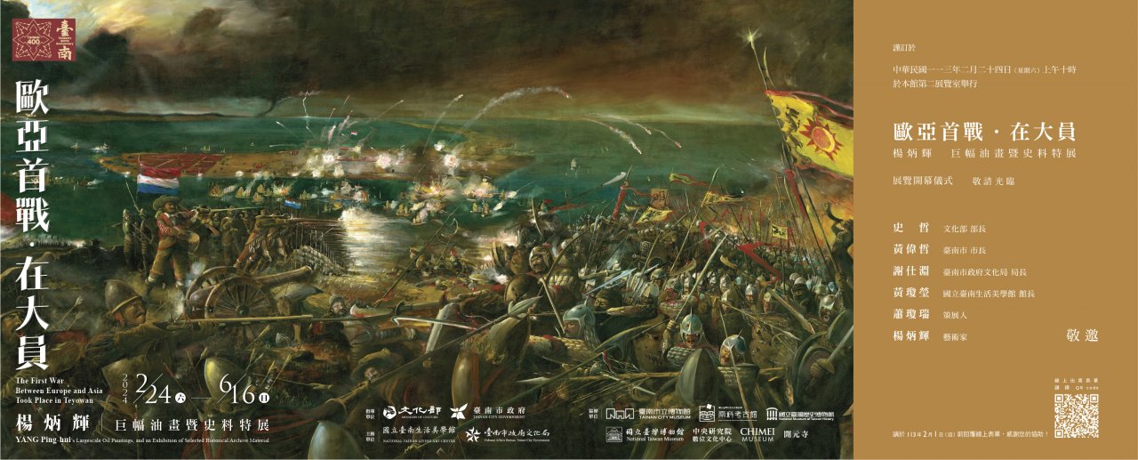 一、為迎接臺南 400 ,由本館邀請國立成功大學蕭瓊瑞名譽教授策劃「歐亞首戰˙在大員─楊炳輝巨幅油畫暨史料特展」,本展以土地為核心,藉由楊炳輝先生的巨幅油畫及史料文獻,生動呈現於今臺南安平地區發生的歷史場景。敬邀貴局及所轄學校校長出席,共襄盛舉。