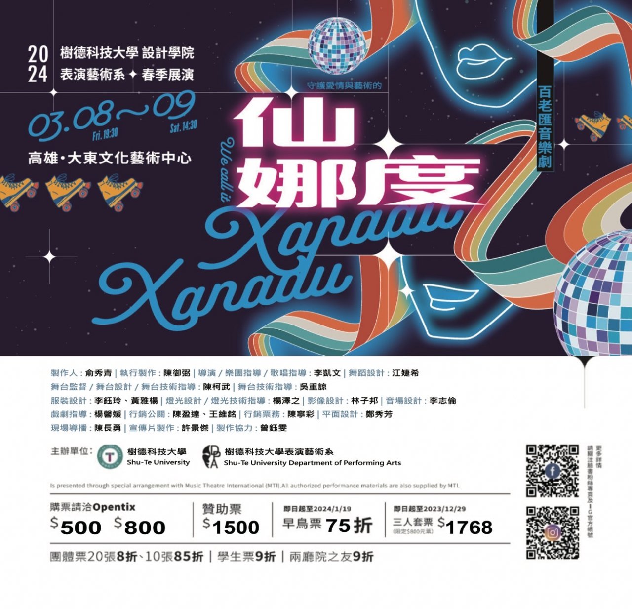 一、樹德科技大學表演藝術系春季展演百老匯音樂劇《仙娜度 XANADU 》將於 113 年 3 月 8 日(五)以及 3 月 9 日(六)於高雄大東文化藝術中心演出,今年春季展演由製作人俞秀青、美籍導演李凱文以及業界各領域專家老師指導,帶領全體表藝系大三學生共同製作。此次演出為亞洲首演,以經典重現,從百老匯買進版權,劇情改編自經典電影《仙娜度的狂熱》,講述繆斯女神與凡人突破困境相戀及創造藝術的故事,內容結合希臘神話及 disco 元素,並加入現場樂團、集結各種舞風以及劇場少見的滑輪鞋元素,為觀眾帶來精彩絕倫的視覺饗宴,樹德科技大學表演藝術系誠摯邀請您前往蒞臨觀賞與指教,給予最大的支持與鼓勵。