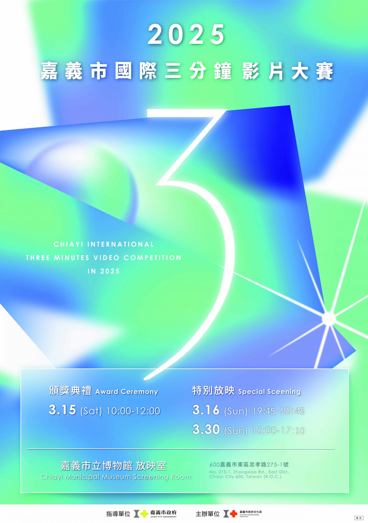 三、 2025 嘉義市國際三分鐘影片大賽放映時間為 114 年 3 月 16 日