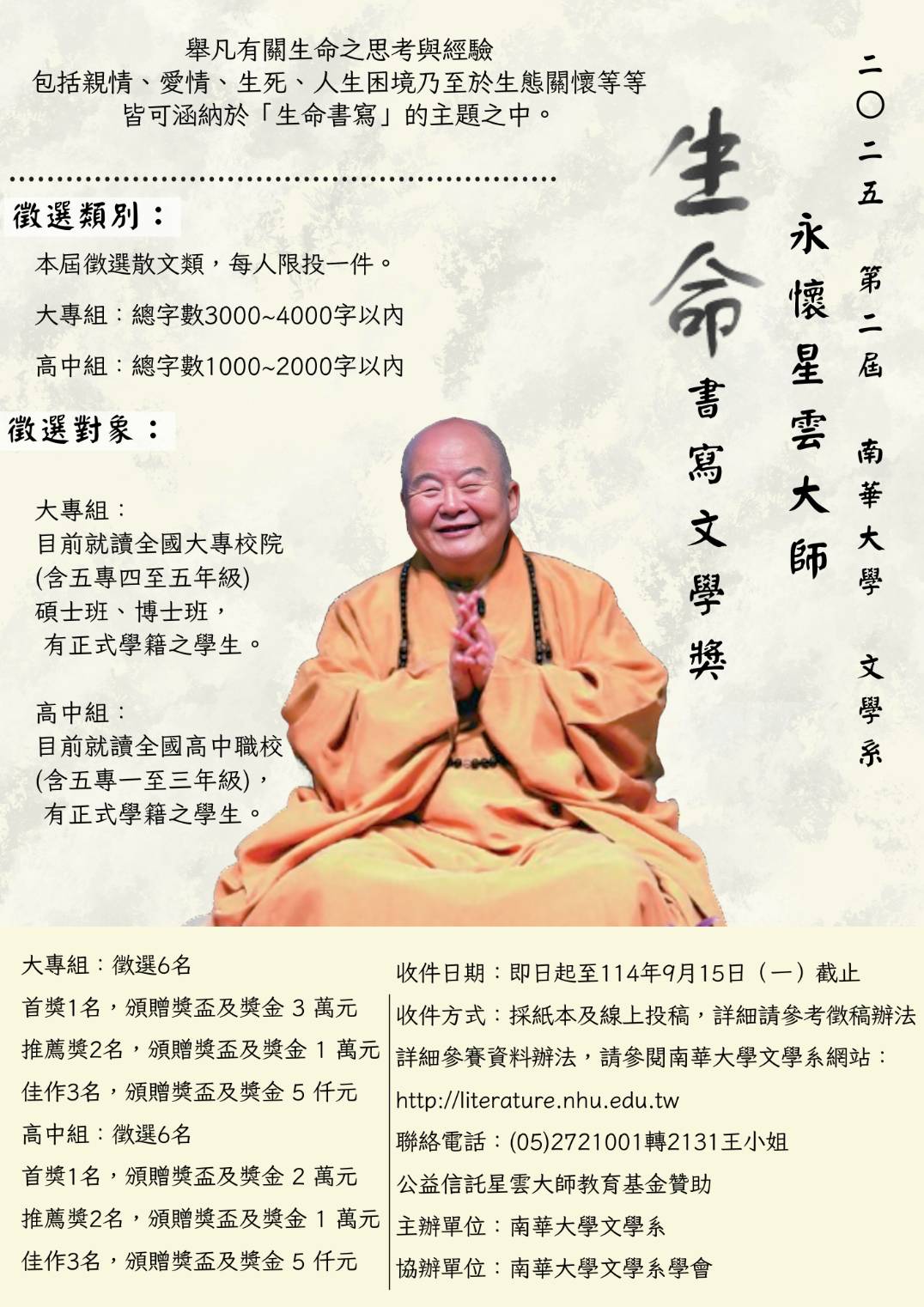 一、徵選類別:本屆徵選散文類,舉凡有關生命之思考與經