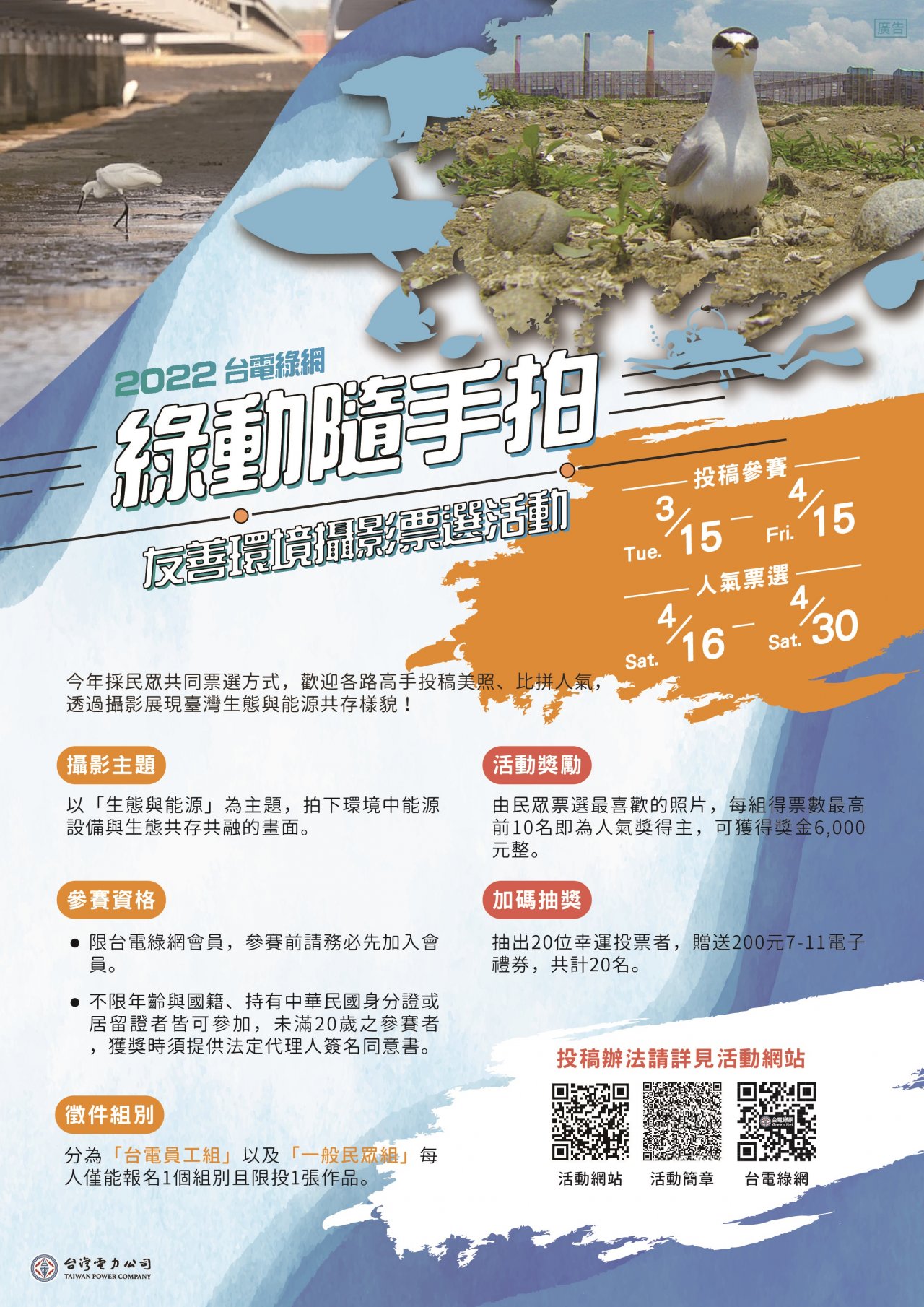 二、「台電綠網」為台電公司就環境友善作為與社會大眾溝通 之平台,本次特辦理旨述活動邀請國人踴躍參與,透過台 電綠網「綠動隨手拍」友善環境攝影票選活動,期望蒐錄 各式與綠網五大主軸(綠色生活、人文采風、生態保育、 低碳永續及循環經濟)有關之動人影像,並進行活動分 享,藉此邀請民眾一同為環境努力,匯集臺灣邁向環境永 續的動力。