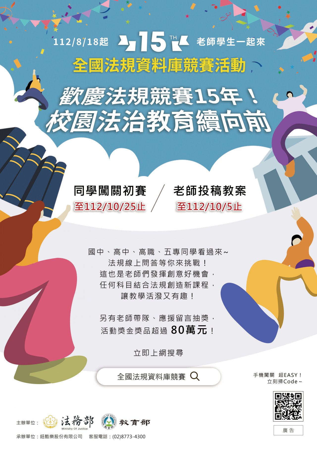 二、為推動全國國中、高中職(含五年制專科學校一、二、三年級)學生及教師能善用全國法規資料庫作為法治教學平臺,法務部與教育部每年共同舉辦全國法規資料庫競賽活動,期藉由辦理旨揭活動,落實法治教育向下紮根,協助學校師生運用全國法規資料庫進行法治教學,發揮法治教育推廣綜效。