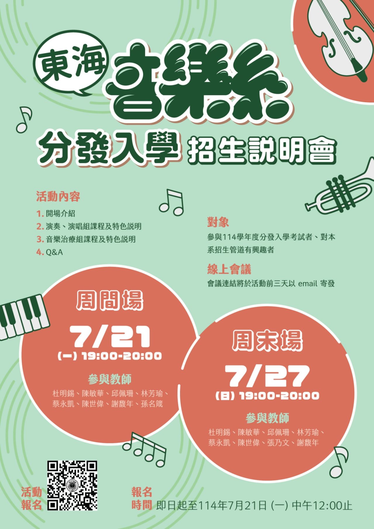 主旨:檢送本校音樂學系辦理二場「東海大學音樂系分發入學招生說明會」活動海報,敬請貴校惠予協助公告並鼓勵學生踴躍報名參與為荷。