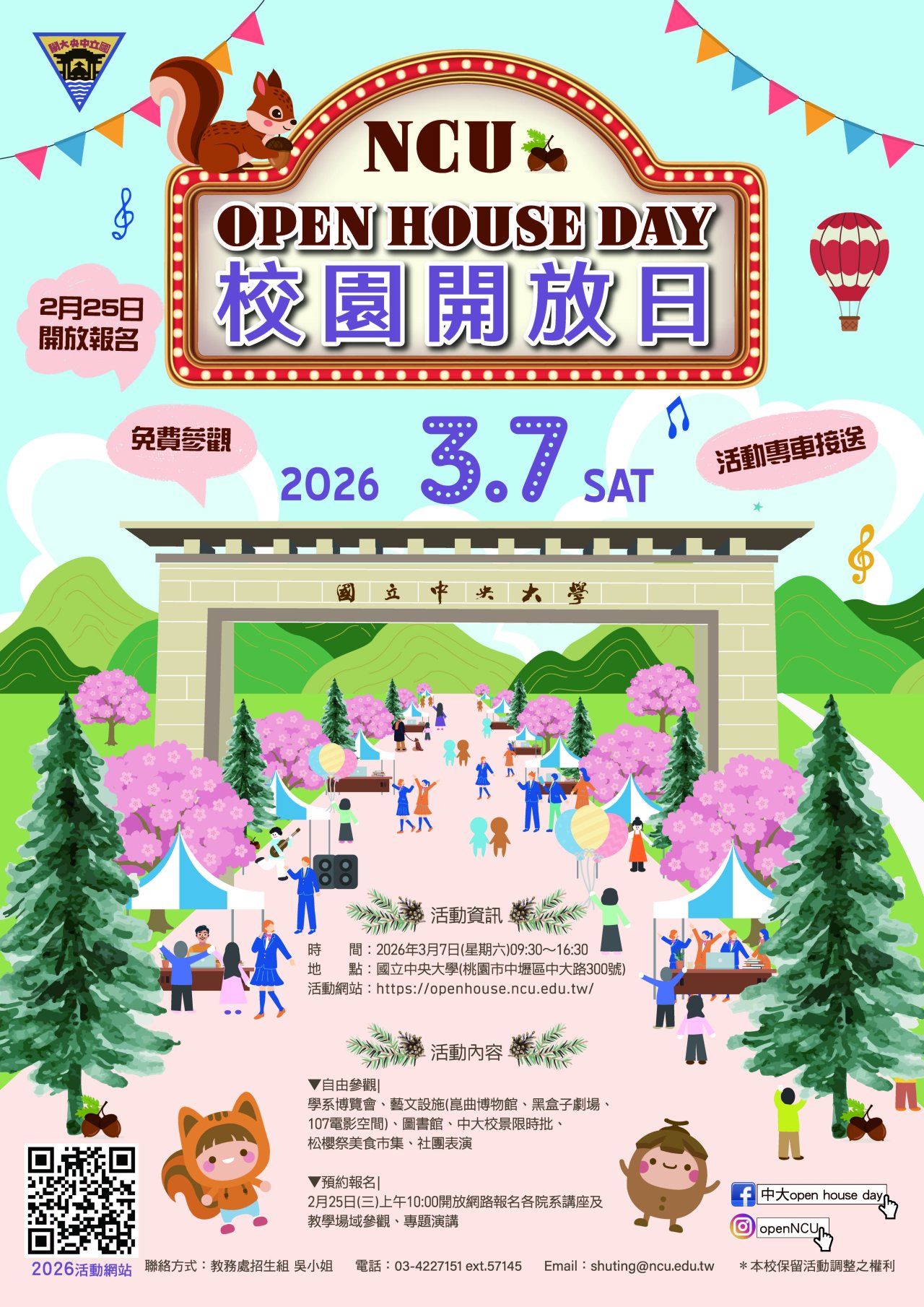 五、相關資訊請參閱活動網站: https://openhouse.ncu.edu.tw/,或於 Facebook 搜尋:中大 open house day ,以及 Instagram:openNCU 。