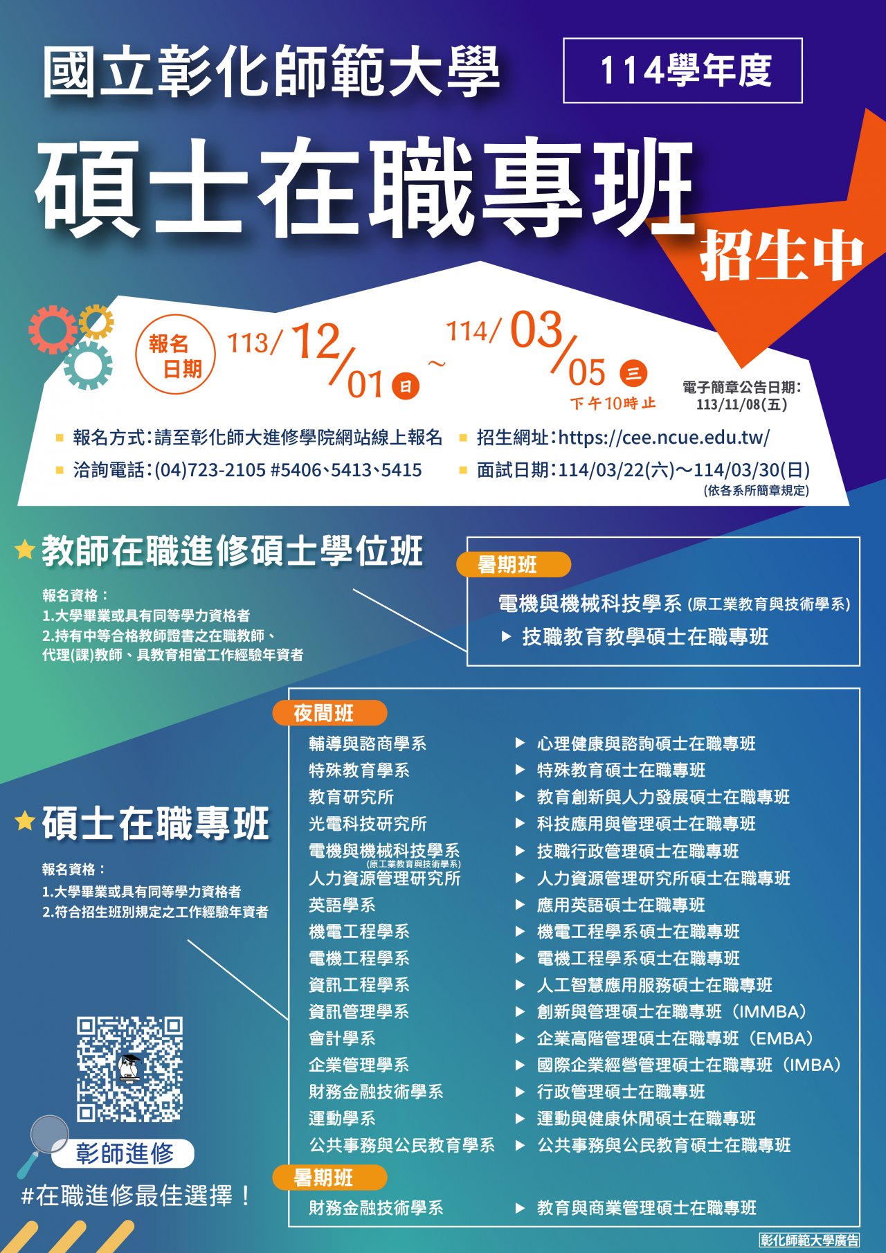 主旨:檢送本校「114 學年度碩士在職專班」招生資訊及海報,敬請惠予轉知貴單位及所屬機關人員報考,並公告周知,請查照。