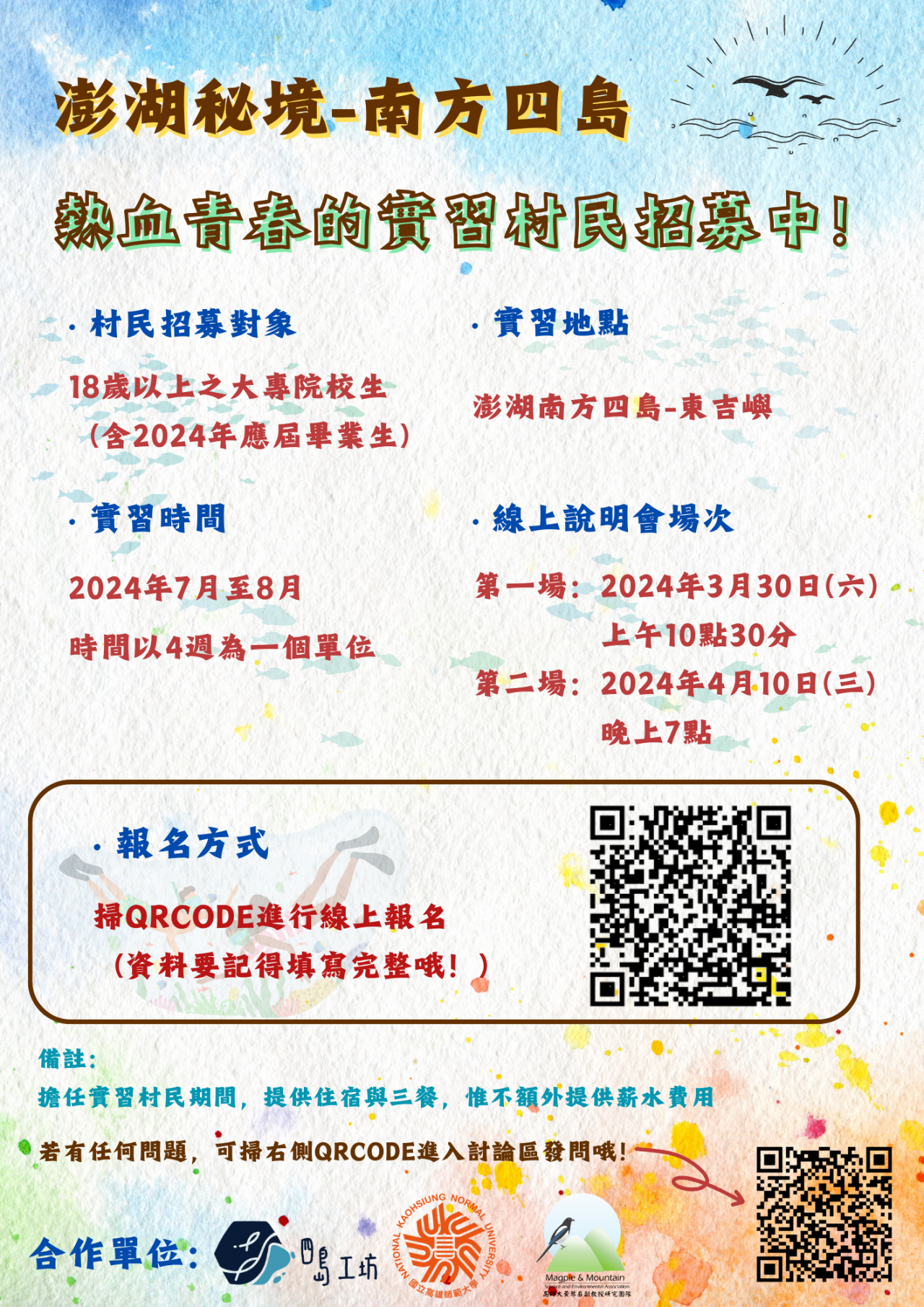 四、內容:歡迎 18 歲以上之大專院校生參加,期能透過打工換宿模式與當地島民交流,讓參與者可體驗島嶼生活的樂趣。