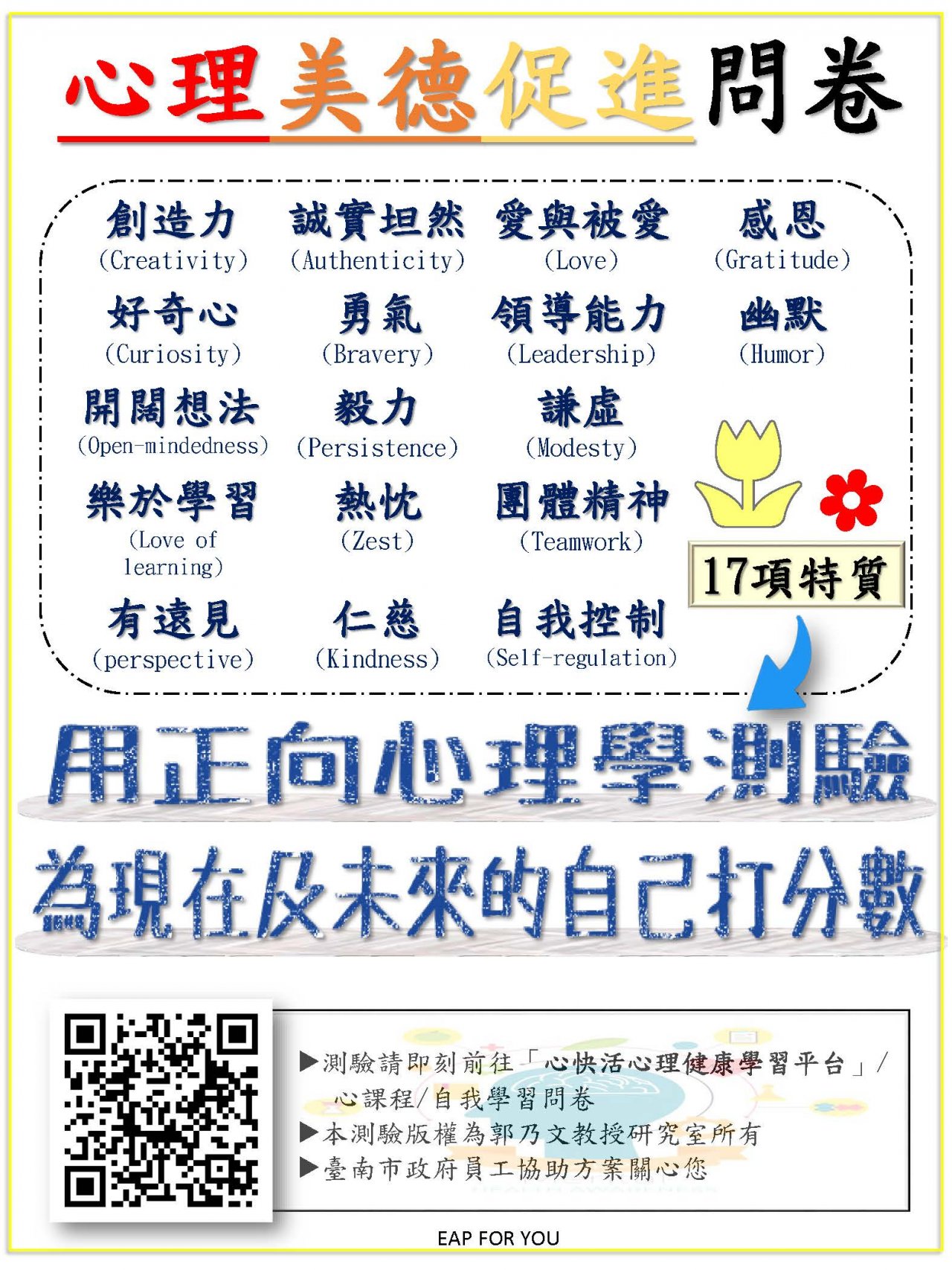 一、心理美德促進問卷共有17道題目~您只要依各項特質為「現在」及「未來」的自己打分數(1~100分),測驗結果將給您最實用的建議及溫暖正向的評語,歡迎同仁一起善用。