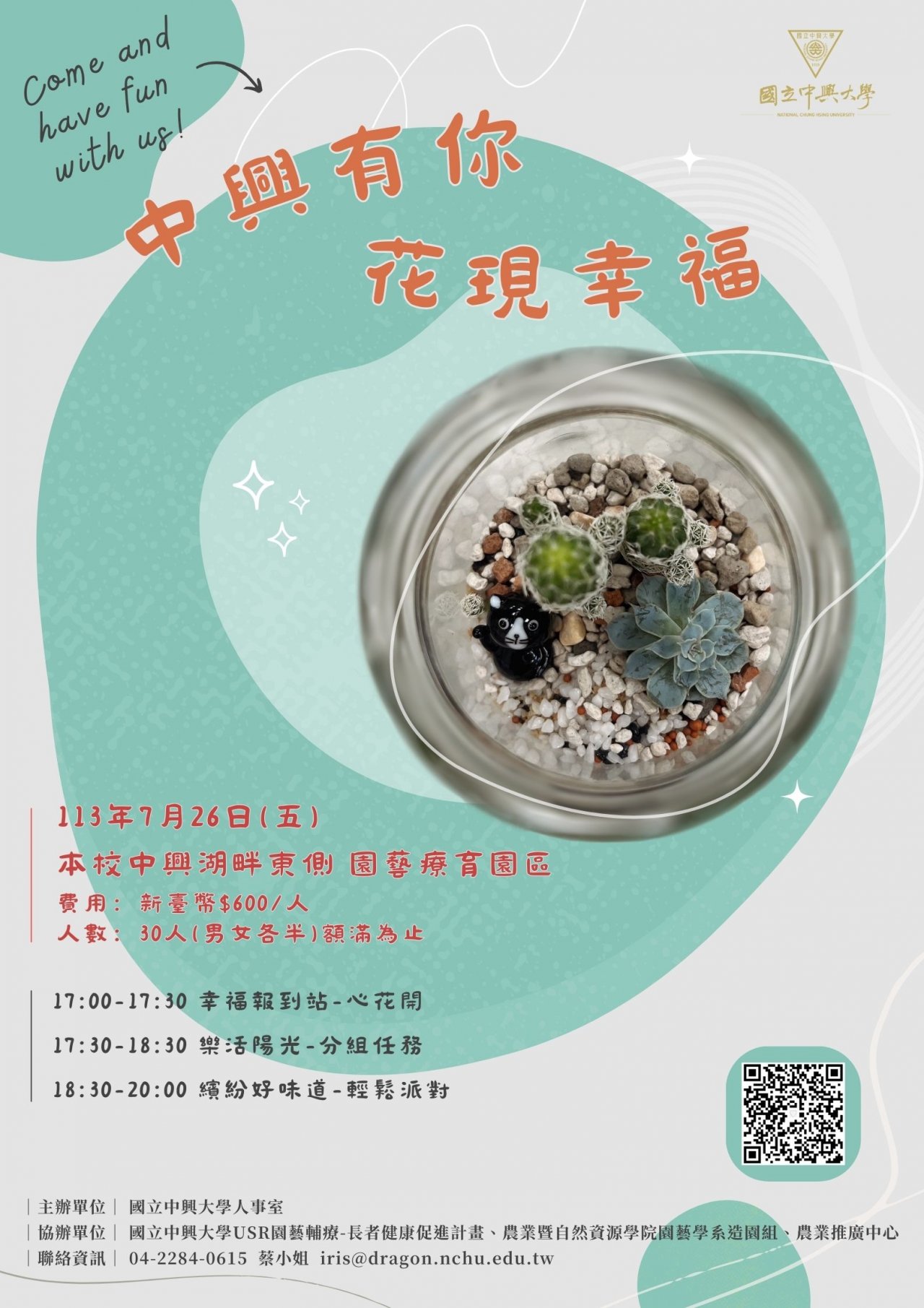 主旨:為辦理本校 113 年「中興有你,花現幸福」單身聯誼活動,檢送實施計畫及活動海報各 1 份,請惠予協助宣傳並鼓勵貴屬符合資格之單身同仁踴躍報名參加,請查照。