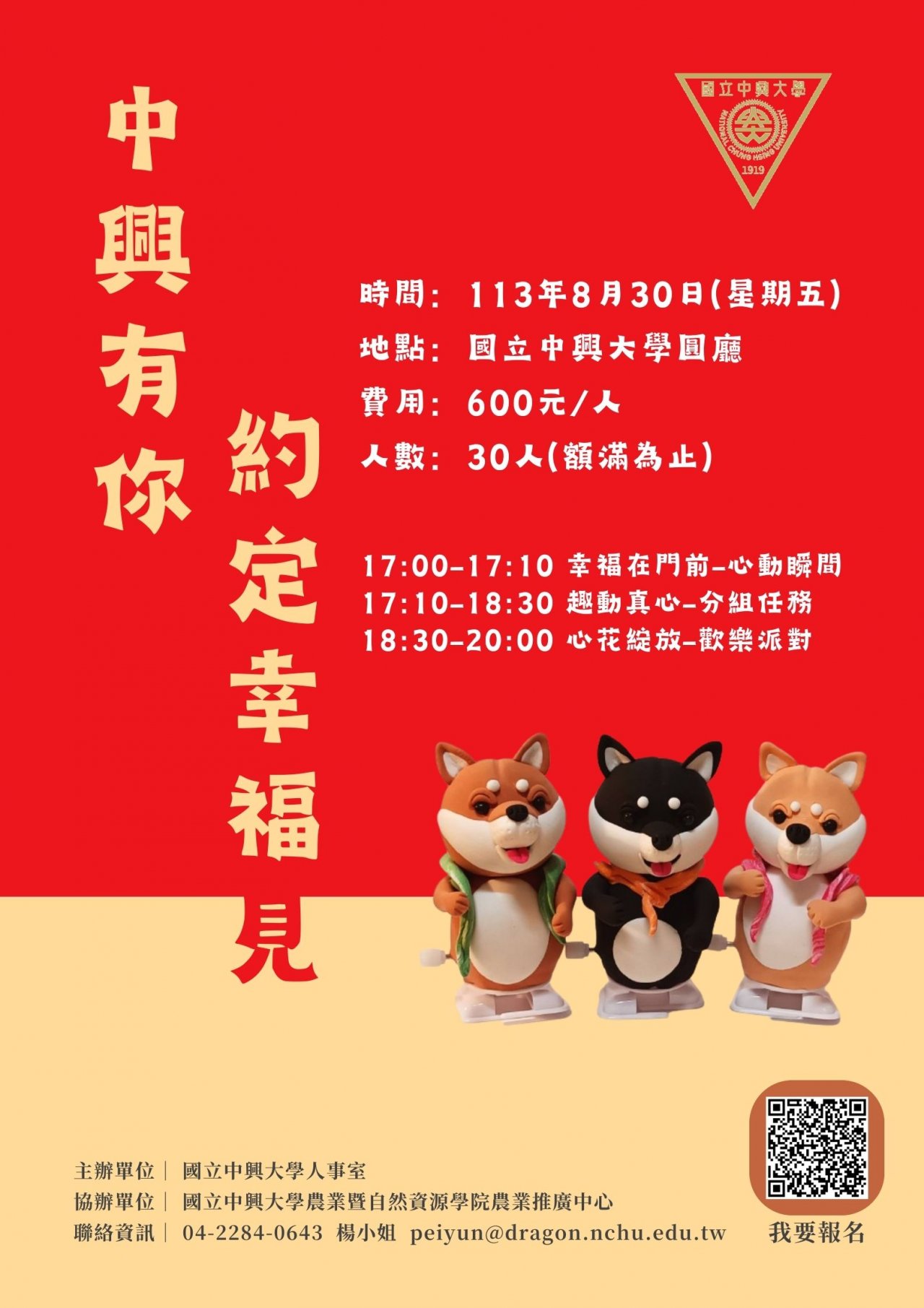 主旨:為辦理本校 113 年「中興有你,約定幸福見」單身聯誼活動,檢送實施計畫及活動海報各 1 份,請惠予協助宣傳並鼓勵貴屬符合資格之單身同仁踴躍報名參加,請查照。