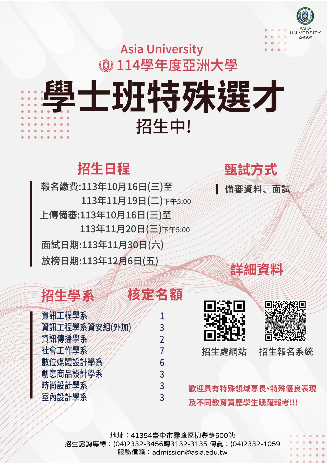 四、招生諮詢服務請洽本校招生處,聯絡電話 04-23323456 轉 3132-3135 。