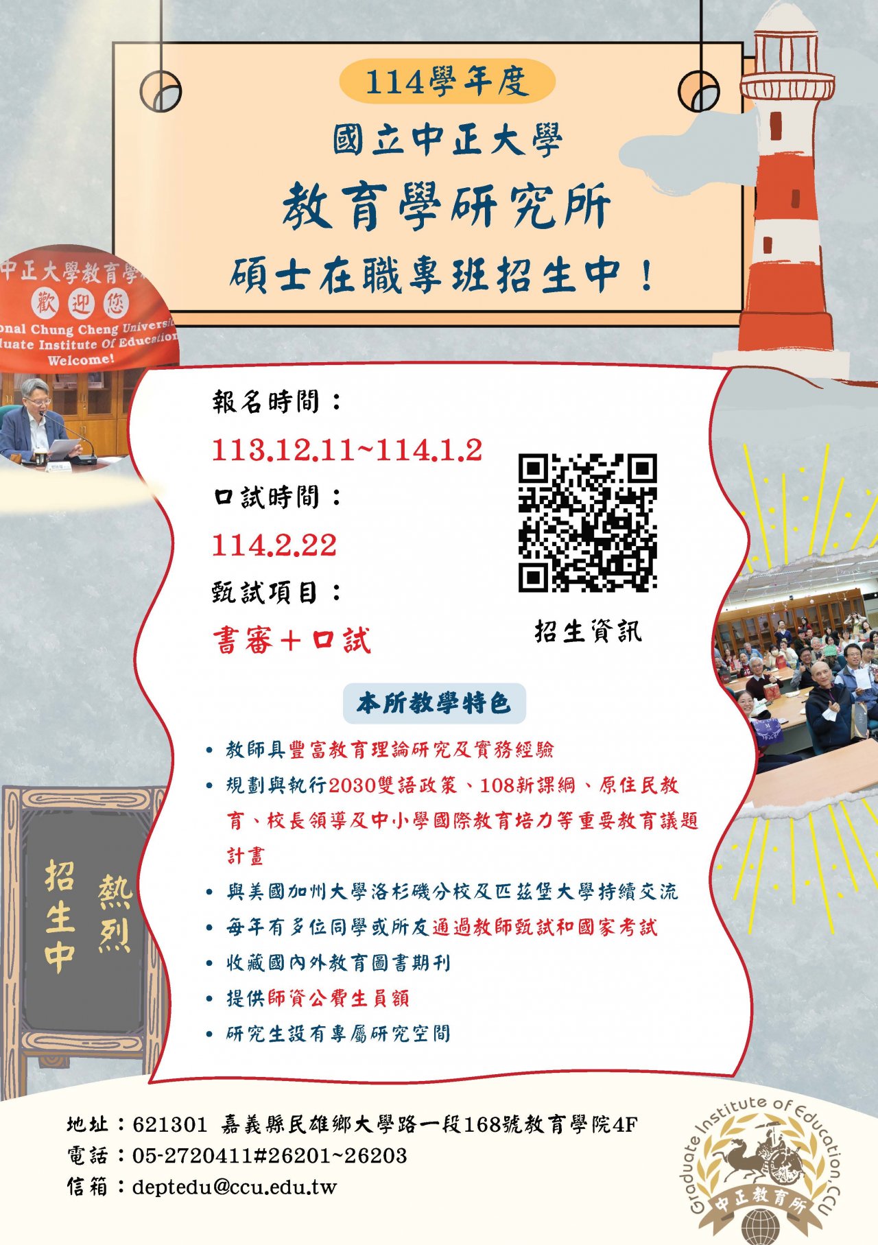 主旨:檢送本校教育學研究所碩士在職專班 114 學年度招生資訊及招生文宣海報 1 份,請惠予公告並轉知貴屬同仁踴躍報考,請查照。