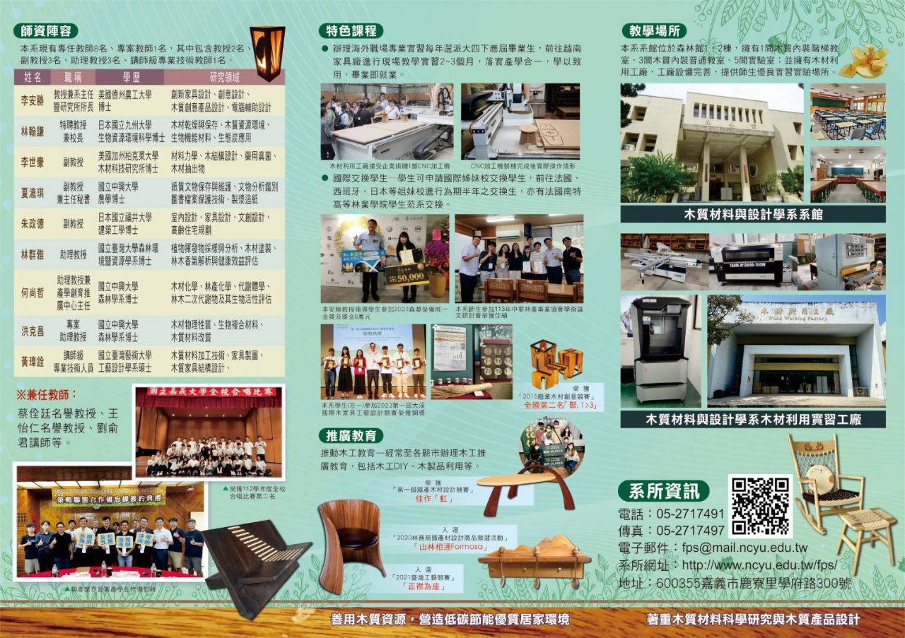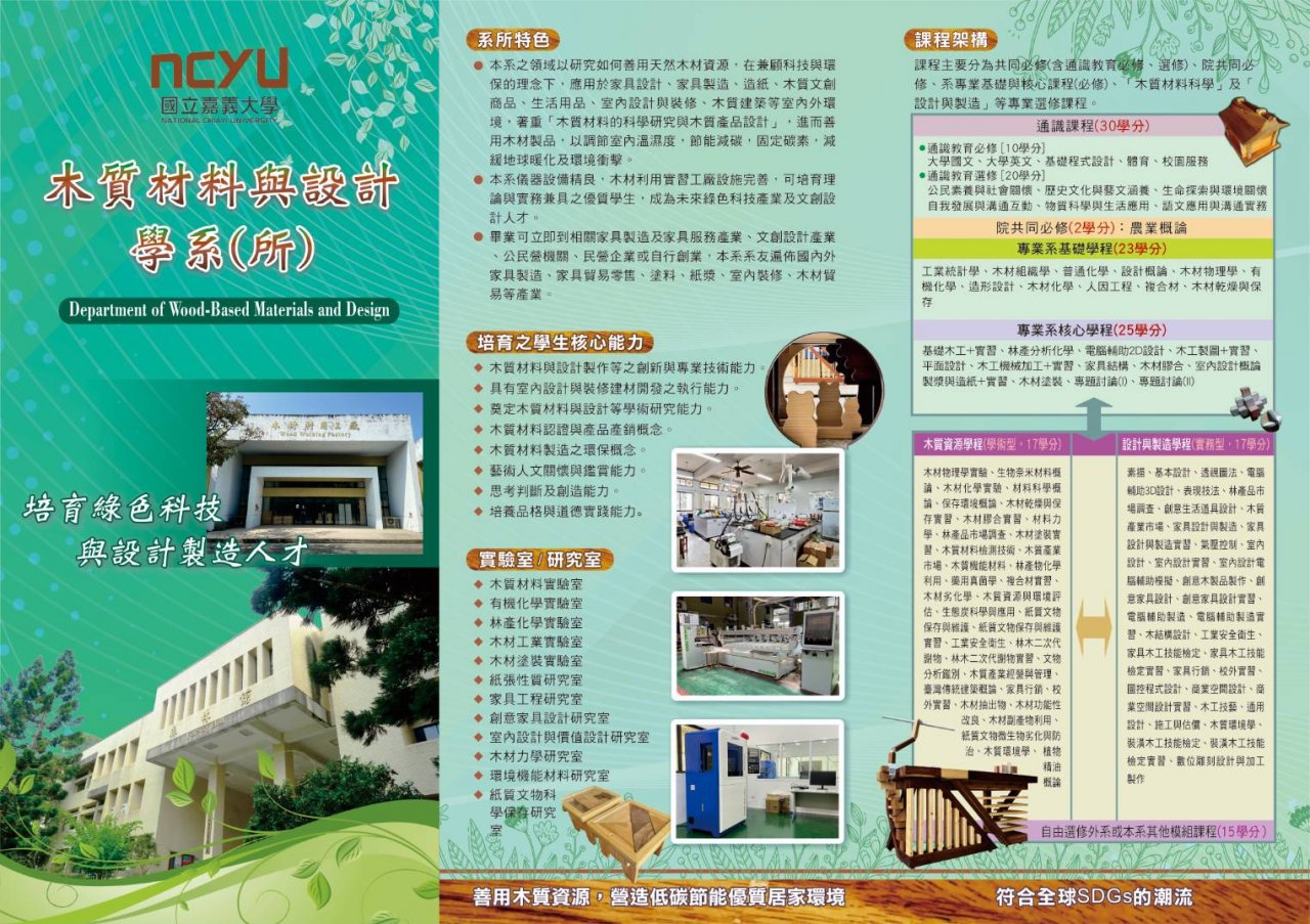 一、該系主要研究如何善用天然木材資源,在兼顧科技與環保理念下,應用於家具設計、家具製造、造紙、木質文創商品、生活用品、室內設計與裝修、木質建築等室內外環境,「著重木質材料的科學研究與木質產品設計,以培養綠色科技與設計製造產業人才,並結合固碳、減碳的環保政策,以符合 SDGs 世界潮流」。