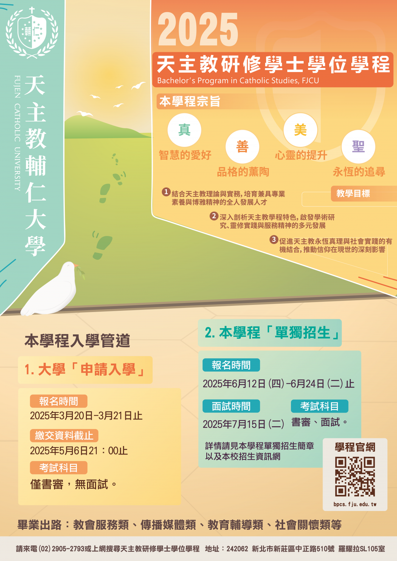 二、該學士學位學程入學管道有「申請入學」與「單獨招生」,請參閱官方網頁,招生資訊: bpcs.fju.edu.tw