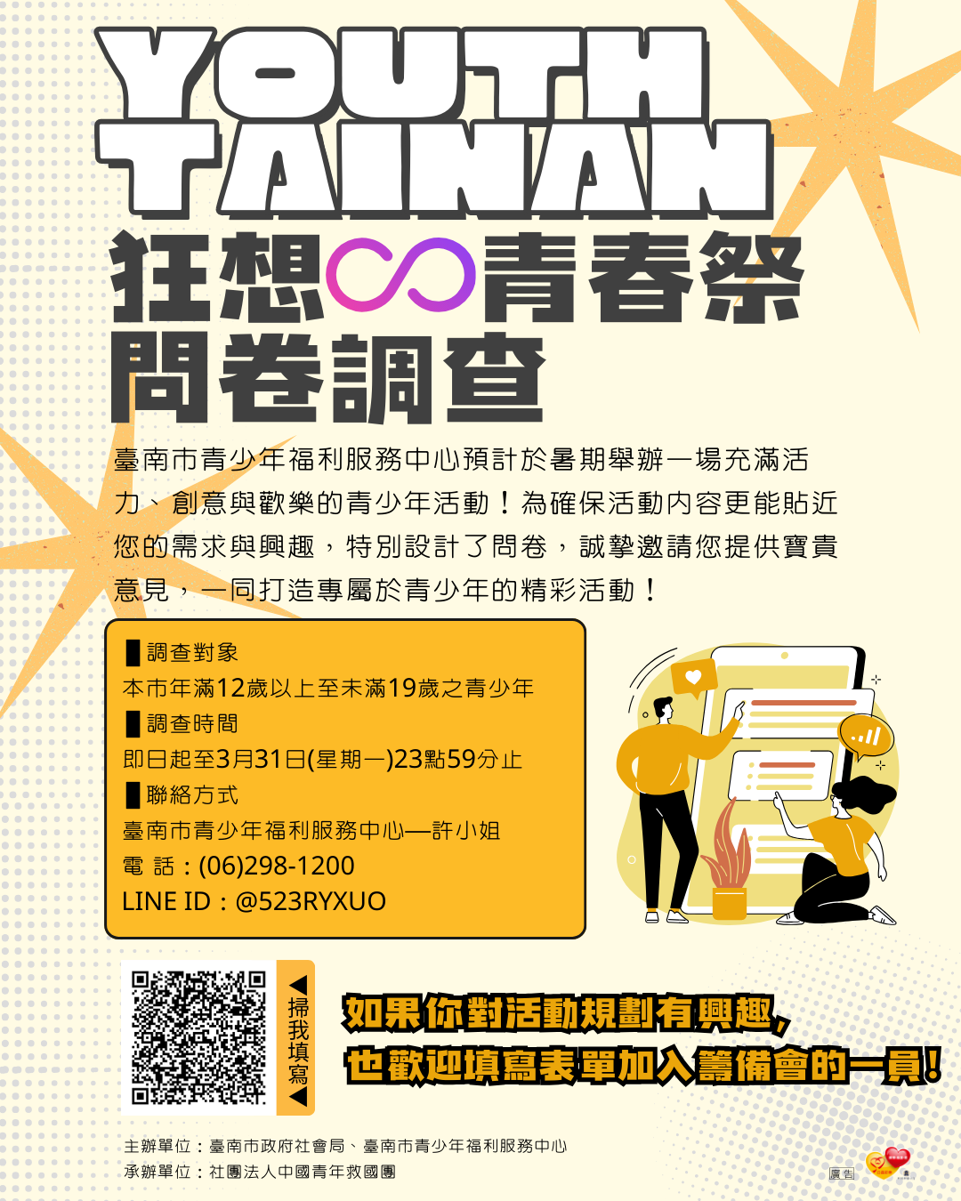 二、本市青少年福利服務中心預定於暑假辦理青少年跨縣市活動,為使活動更貼近本市青少年所需,符合青少中心期待,該中心擬訂活動調查表 1 份,協請貴校協助宣傳(調查表網址: https://forms.gle/tFmtc9k6VfPtWai77 ),該調查表採不記名,請安心填報。