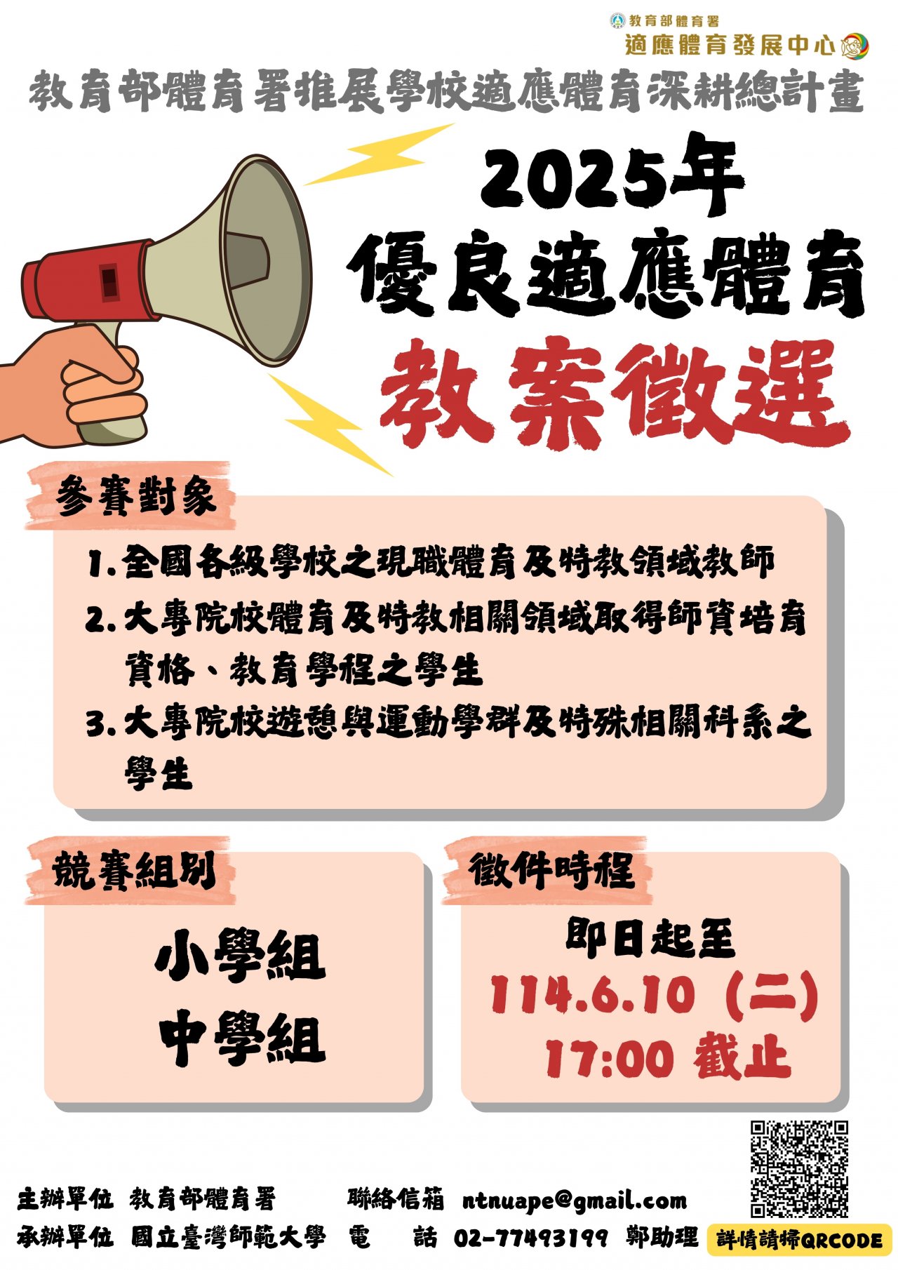主旨:檢送體育署委請國立臺灣師範大學辦理「2025 年優良適應體育教案徵選實施計畫」活動簡章、投稿須知及宣傳海報 1 份,請轉知所屬教師踴躍報名參加,請查照。