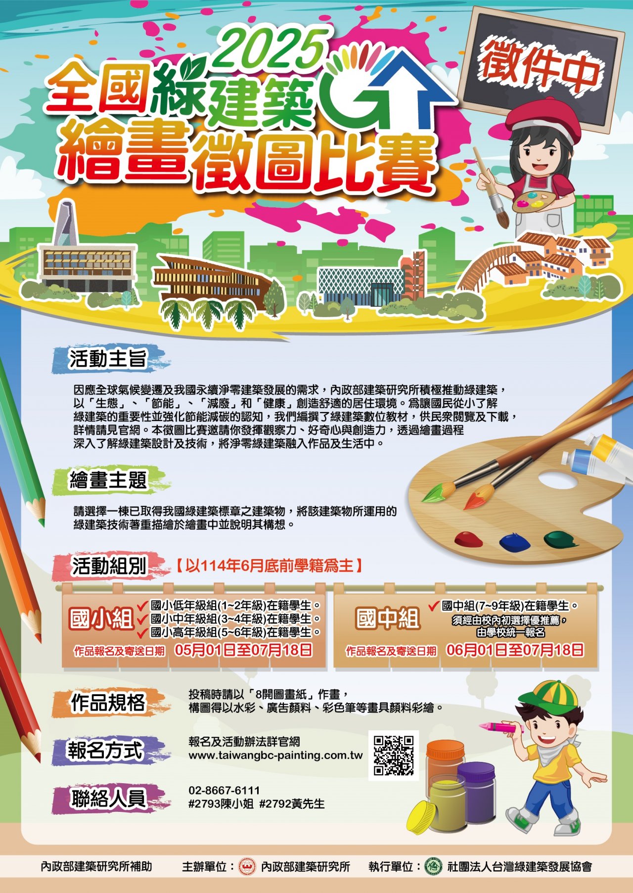 (四)活動詳情與報名資訊,請至本所補助單位社團法人台灣綠建築發展協會比賽官網( http://www.taiwangbc-painting.com.tw )查詢,或撥打聯絡電話(02)8667-6111 分機 2793 、 2792 洽詢。