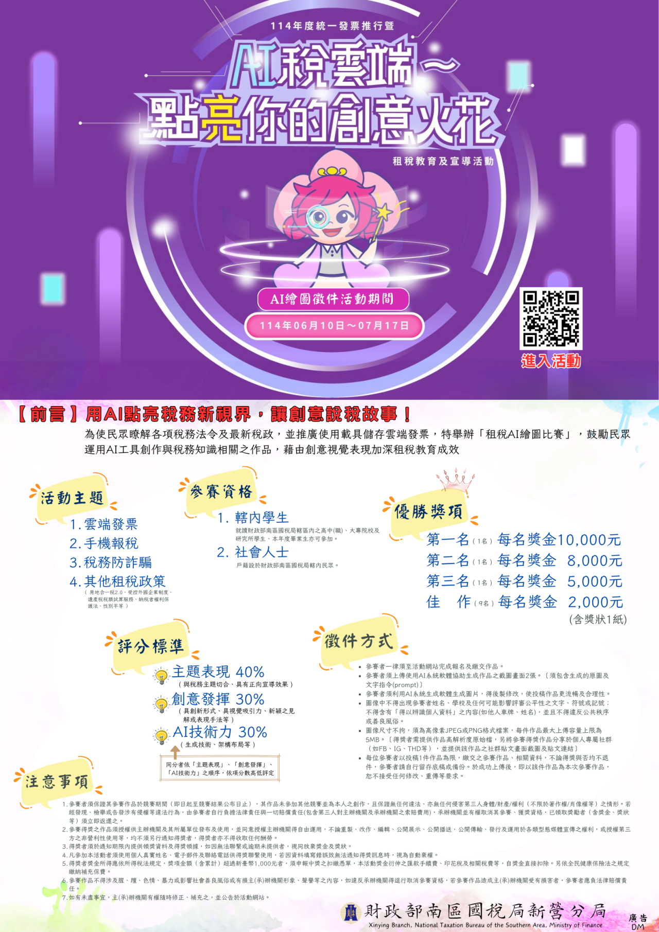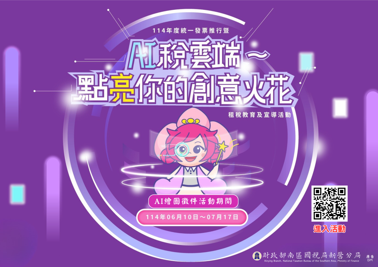 一、活動連結網站: https://xinying114.fastez.net/ 。 二、電子字幕宣導內容:南區國稅局新營分局舉辦「AI 稅雲端~ 點亮你的創意火花」活動之租稅 AI 繪圖作品徵件至 114 年 7 月 17 日截稿,歡迎民眾或學生踴躍創作投稿,活動辦法請 至徵件活動網站或南區國稅局官方網站查詢。