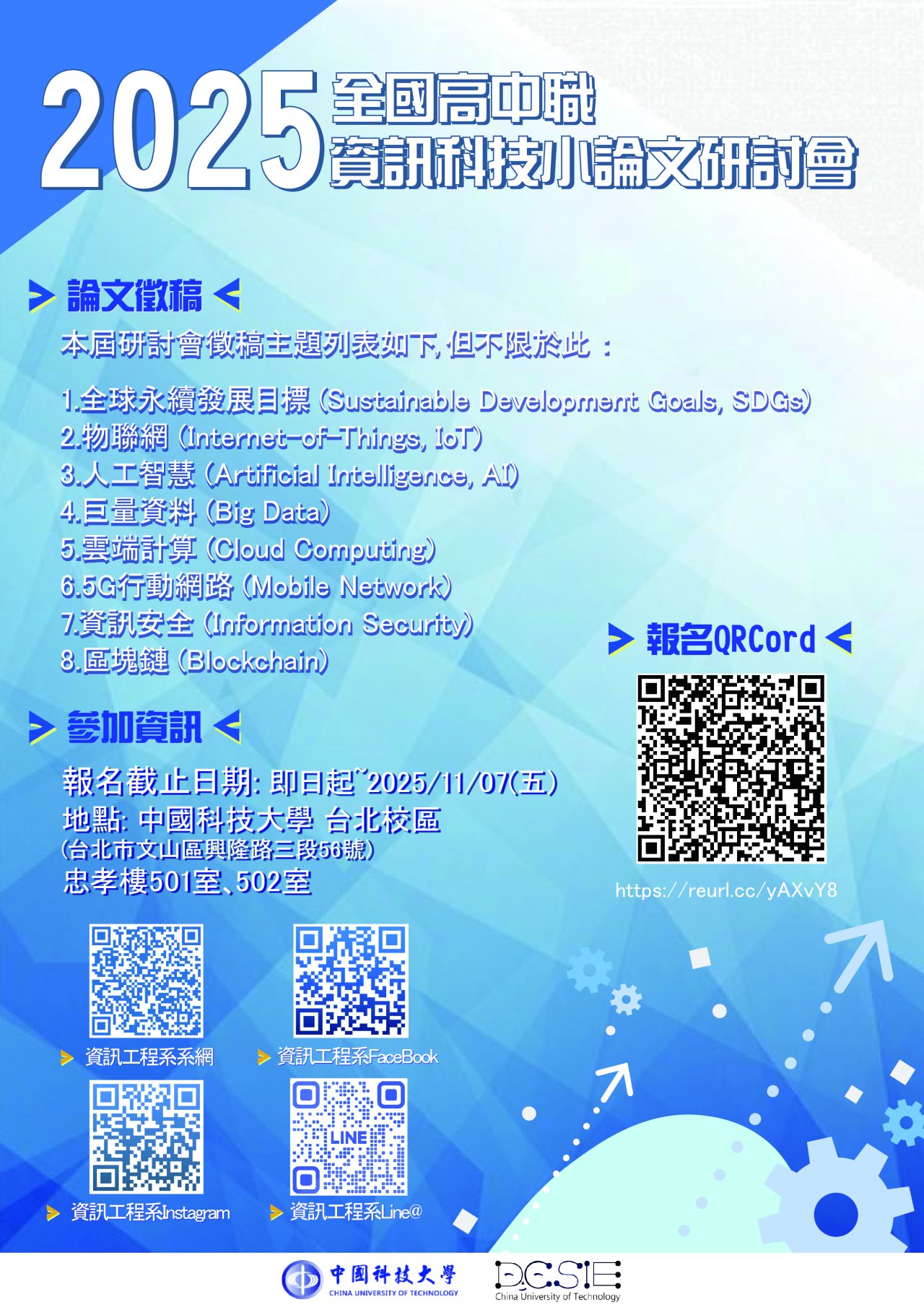 中國科技大學資訊學院資訊工程系辦理「2025全國高中職小論文研討 會」,請轉知各校同學踴躍投稿。
