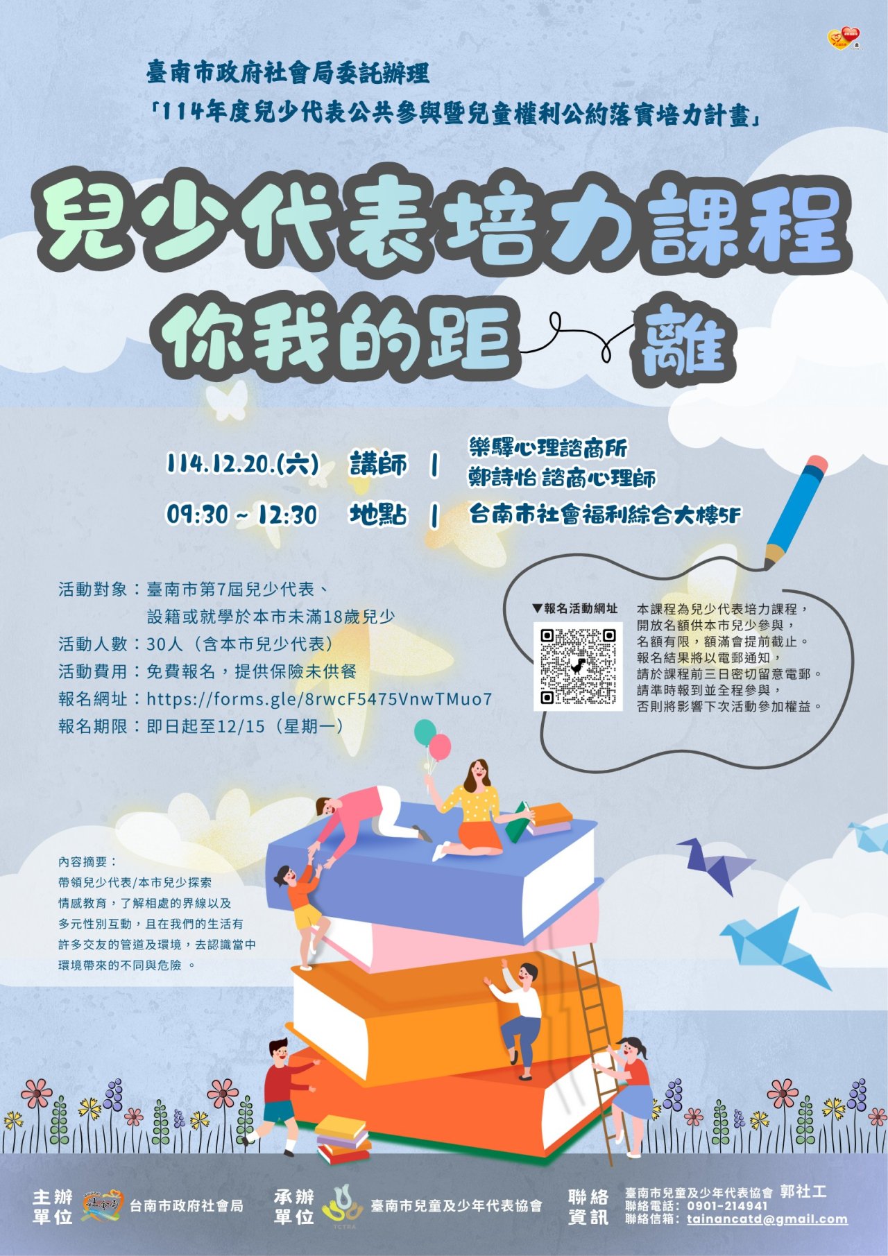 二、旨揭課程資訊摘要如下: (一)課程名稱:兒童及少年代表培力課程─你我的距離 1、課程時間: 114 年 12 月 20 日(星期六)上午 9 時 30 分至 下午 12 時 30 分( 9 時 15 分開始報到) 2、報名期限: 114 年 12 月 15 日(星期一),人數額滿即提 早結束。