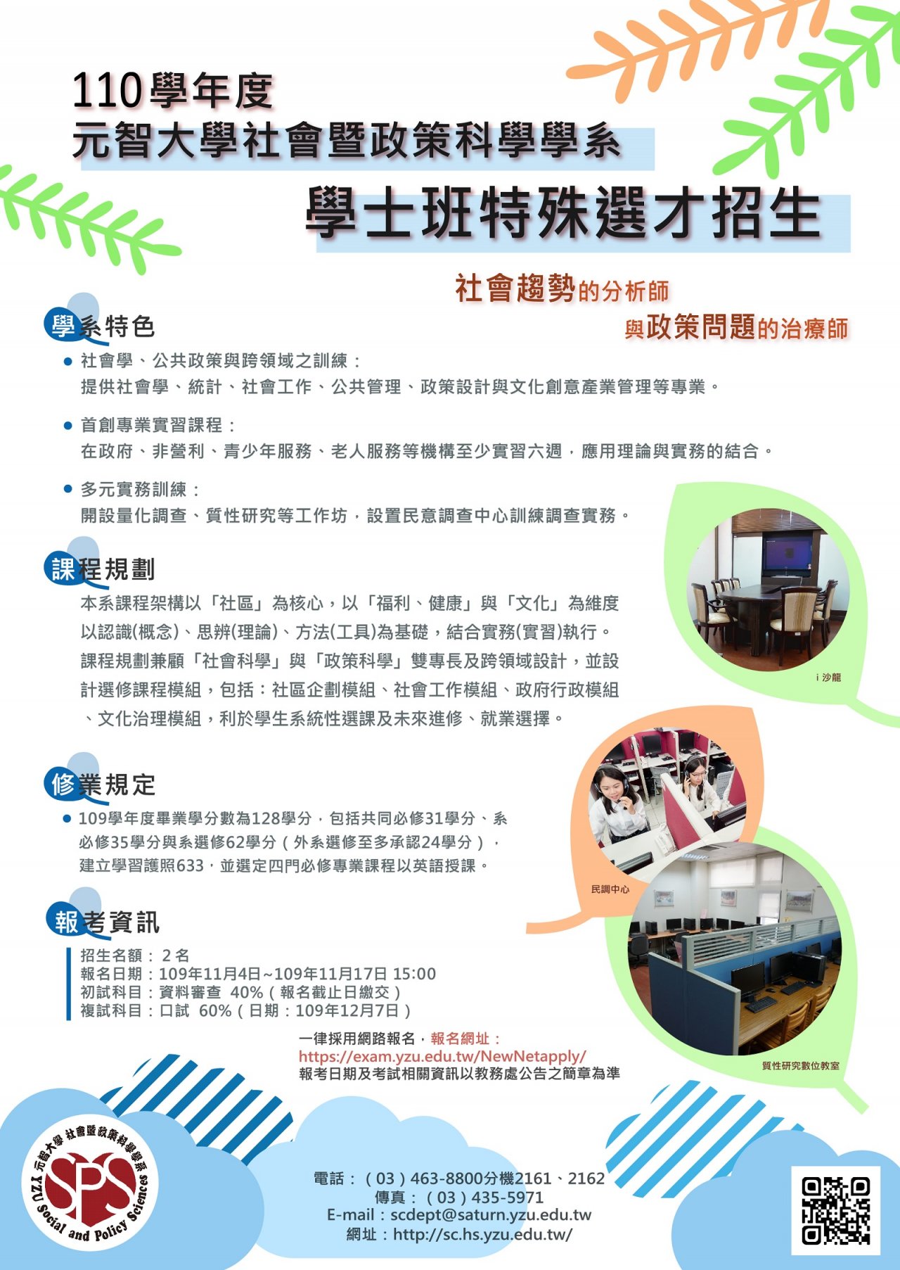 元智大學社會暨政策科學學系 110 學年度學士班特殊選才招生文宣,招生資訊網址: