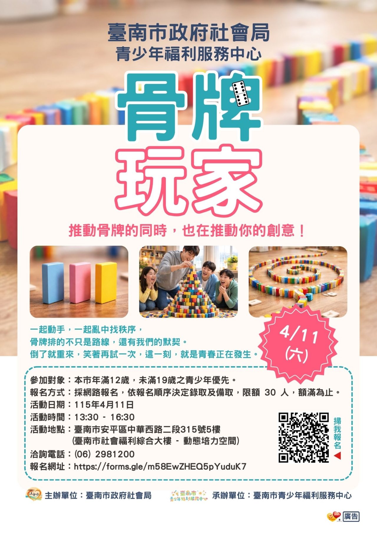 二、跑馬燈播放文字參考如下:臺南青少中心強勢登場!4 月 11 日【骨牌重建挑戰】專注力全面升級; 4 月 26 日【無人機足 球開戰】揪團組隊熱血對決!報名請洽 06-2981200 。