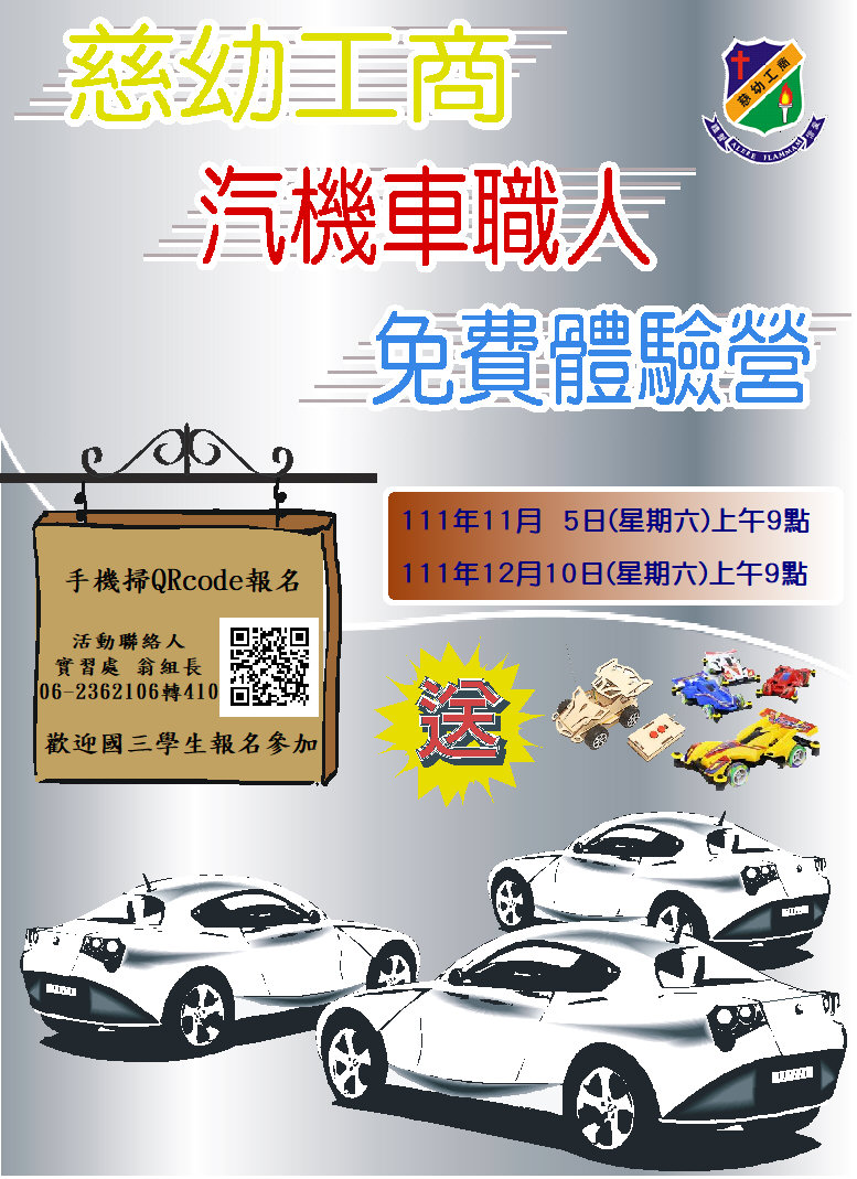 八、參加對象:國三及高中職有興趣之學生。九、報名方式:請洽慈幼工商實習組翁如慧組長(06)2362106 分機 410 。或填寫線上報名表,網址: https://forms.gle/99GwVukNJKkg5qb8A ,報名 QRcode 如附件。十、報名時間:即日起至額滿為止。