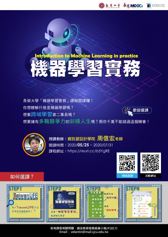 主旨:長榮大學磨課師(MOOCs)線上課程「機器學習實務」即日起開放線上報名,敬請惠予公告並鼓勵貴校師生踴躍報名,請查照。