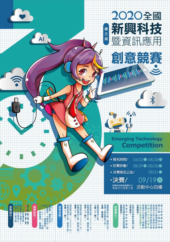 二、檢附「2020 年全國新興科技暨資訊應用創意競賽」簡章以及活動宣導海報乙份,敬請貴單位協助於學校網站公告及鼓勵師生踴躍參加,並請惠准參加決賽活動之師生公假前往為荷。