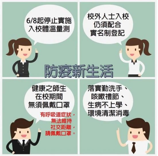三、 健康之師生於在校期間無須佩戴口罩,惟如有發燒、咳嗽、流鼻涕等呼吸道症狀者,請務必戴口罩。無法維持社交距離時,請佩戴口罩。