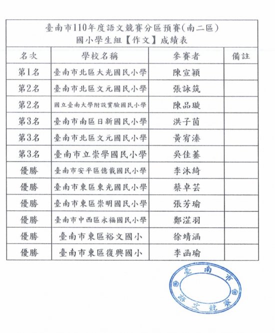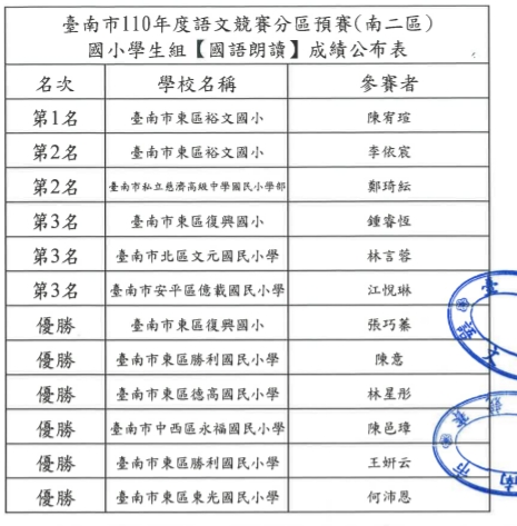 賀喜!!本校學生參加臺南市110年度語文競賽分區預賽  亮眼表現 再占鰲頭