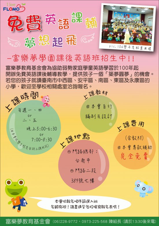主旨:檢送 106 學年度本會「富樂夢學園」總部課後免費英語教學專案招生說明