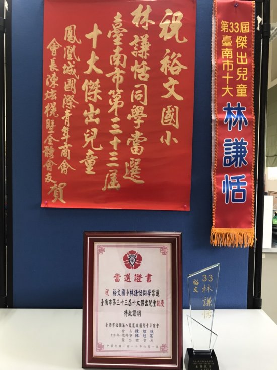 恭賀 六年級林謙恬同學當選台南市第三十三屆十大傑出兒童