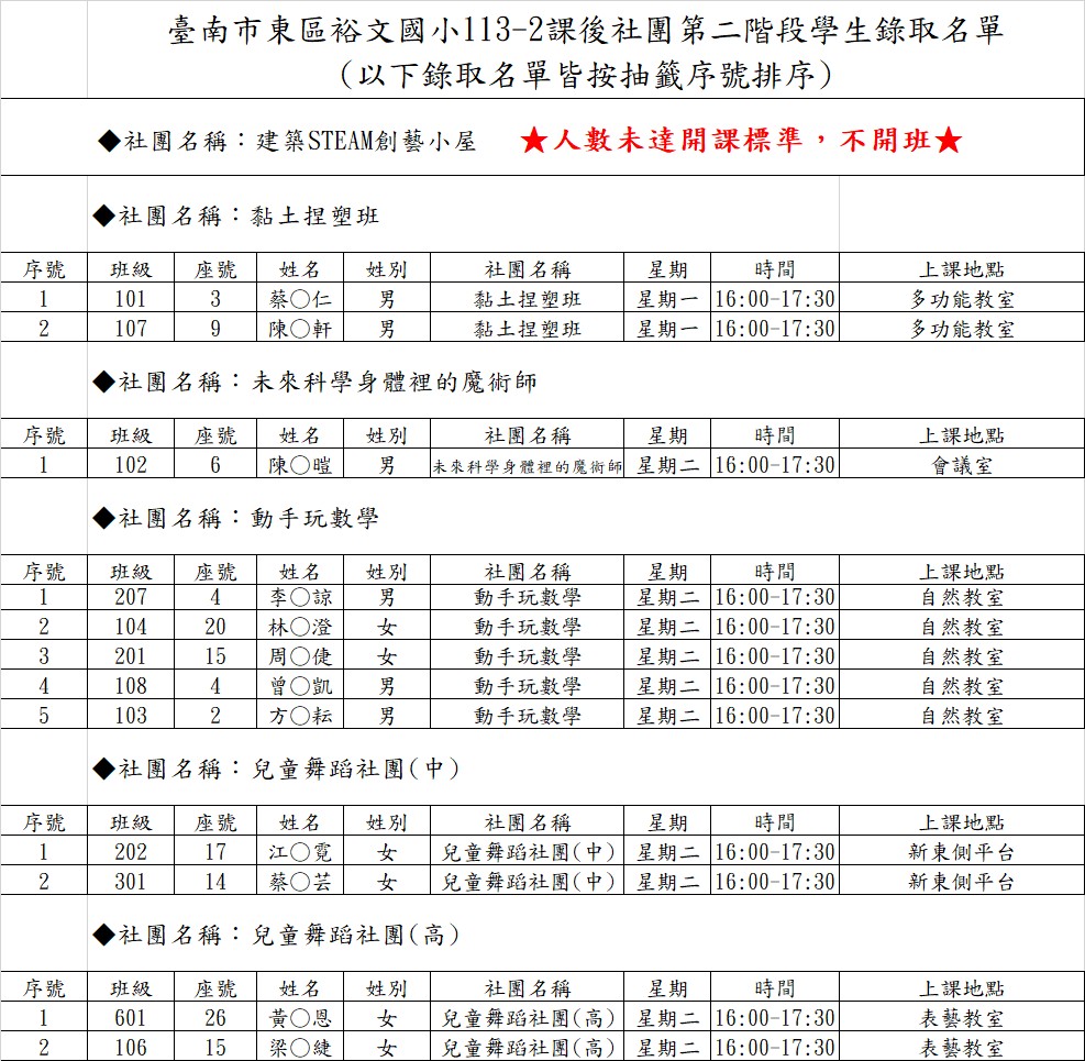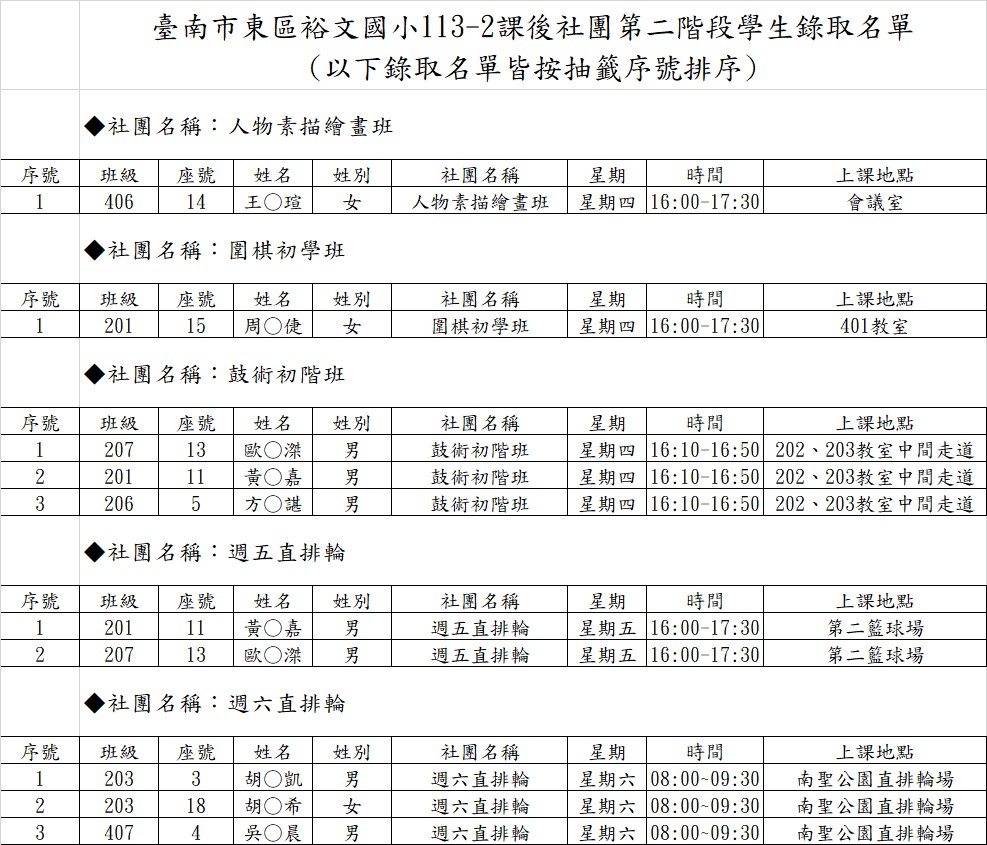 一、113學年度第2學期課後社團錄取名單(第二階段)如附檔。